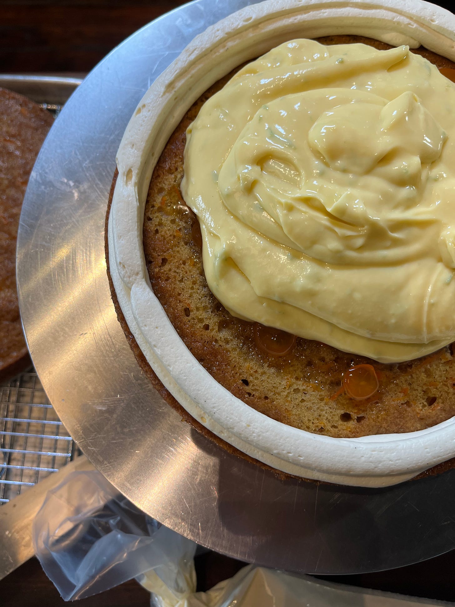 The version I present today reflects my current tastes. The cream cheese frosting, once an American-style buttercream, is now custard-based, which gives it the most delicious creamy texture (and makes it less sweet). I’ve leaned into my pairing of warm spiced carrot cake + citrus by including a lime and condensed milk curd, which has a terrifically nostalgic flavour like key lime pie. A little coriander in the carrot cake plays nicely with the citrus, and I still add a splash of orange blossom water and a hefty dollop of vanilla bean paste to the buttercream. The flavour still takes me back to those chill foggy days in San Francisco and the restaurant that still remains my favourite cooking job I’ve ever had.