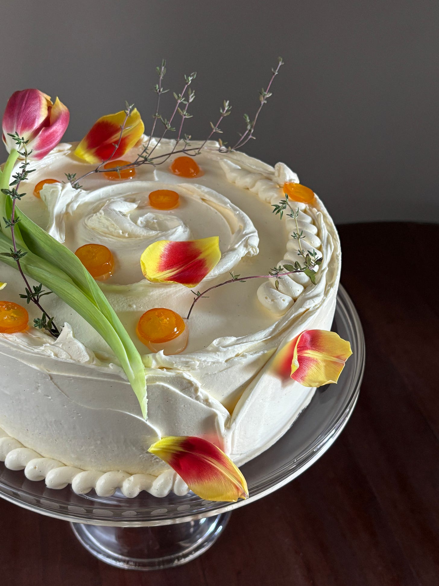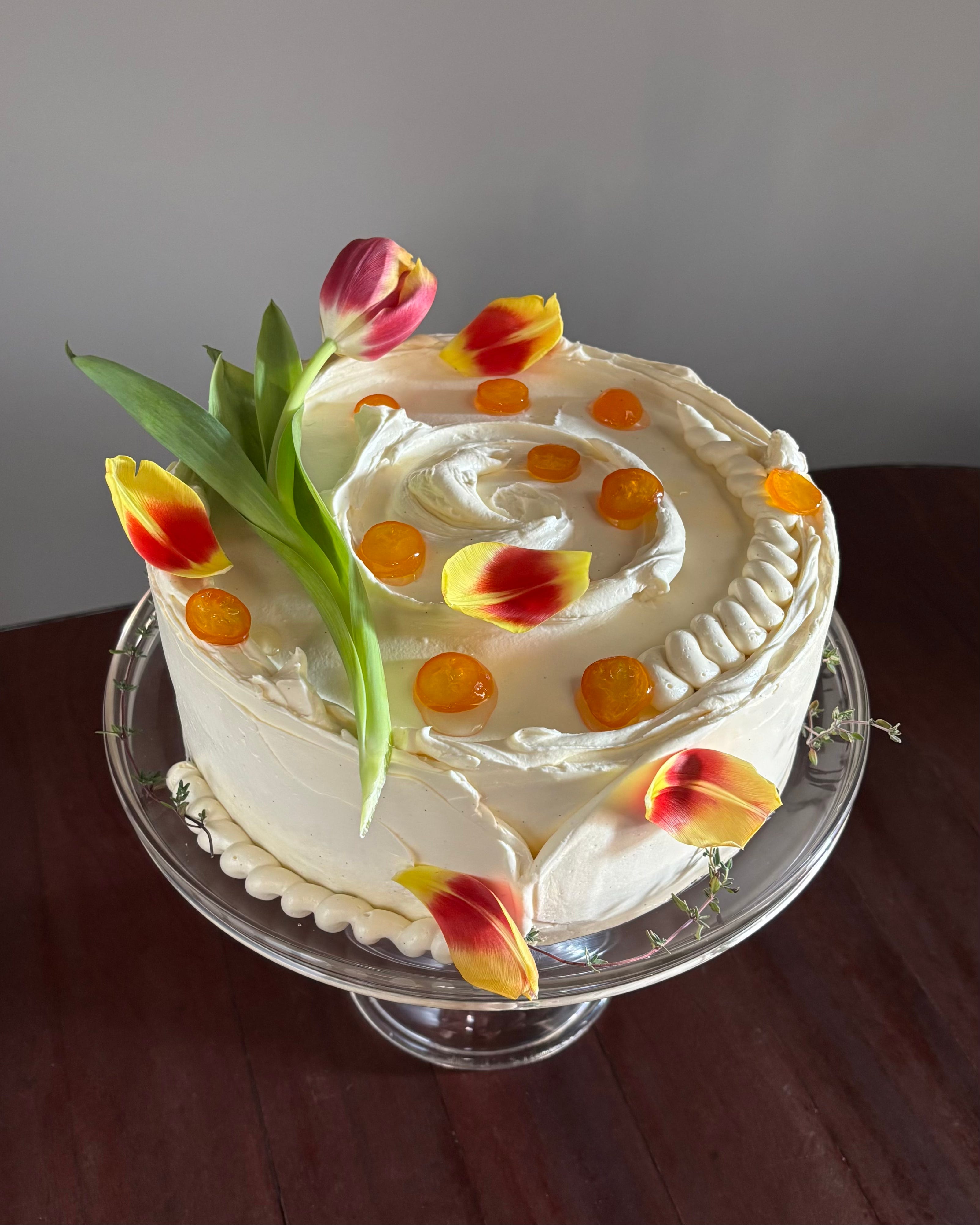 This isn’t a massive stacked layer cake like I used to make. These days I prefer two slimmer layers. I’ll always top it with candied kumquats, though, which are simmered slowly in the oven in a bath of simple syrup to preserve their shape.