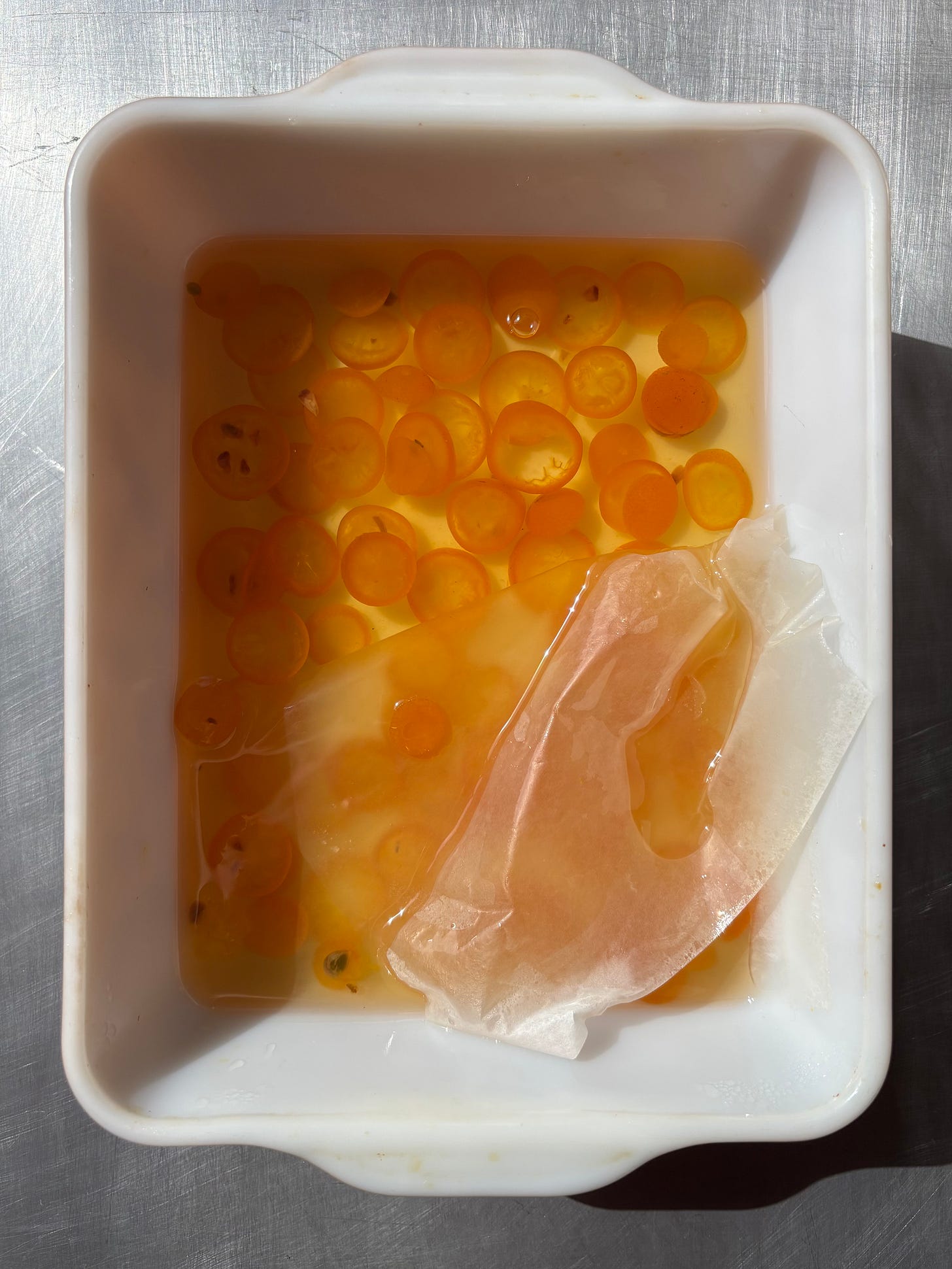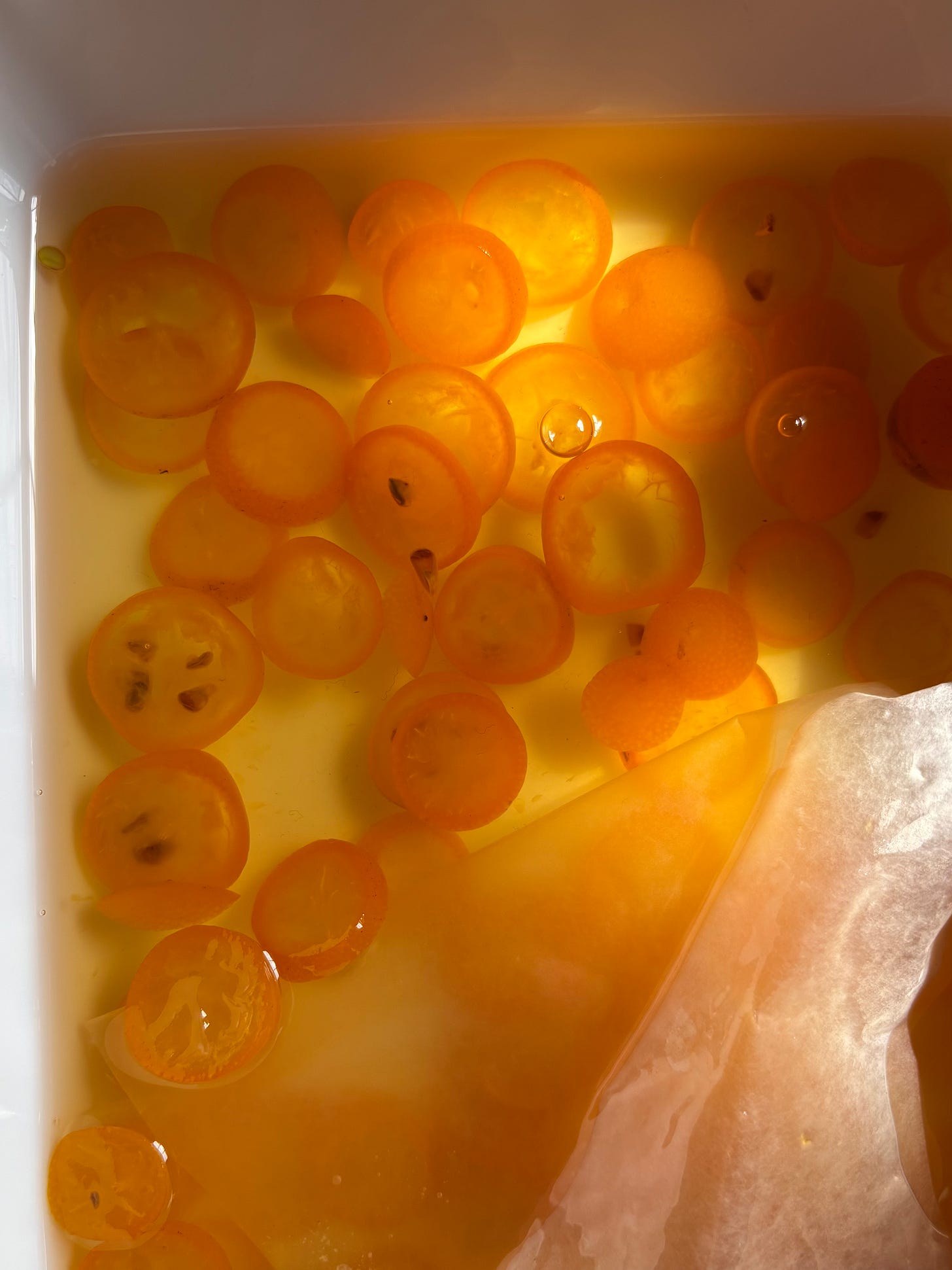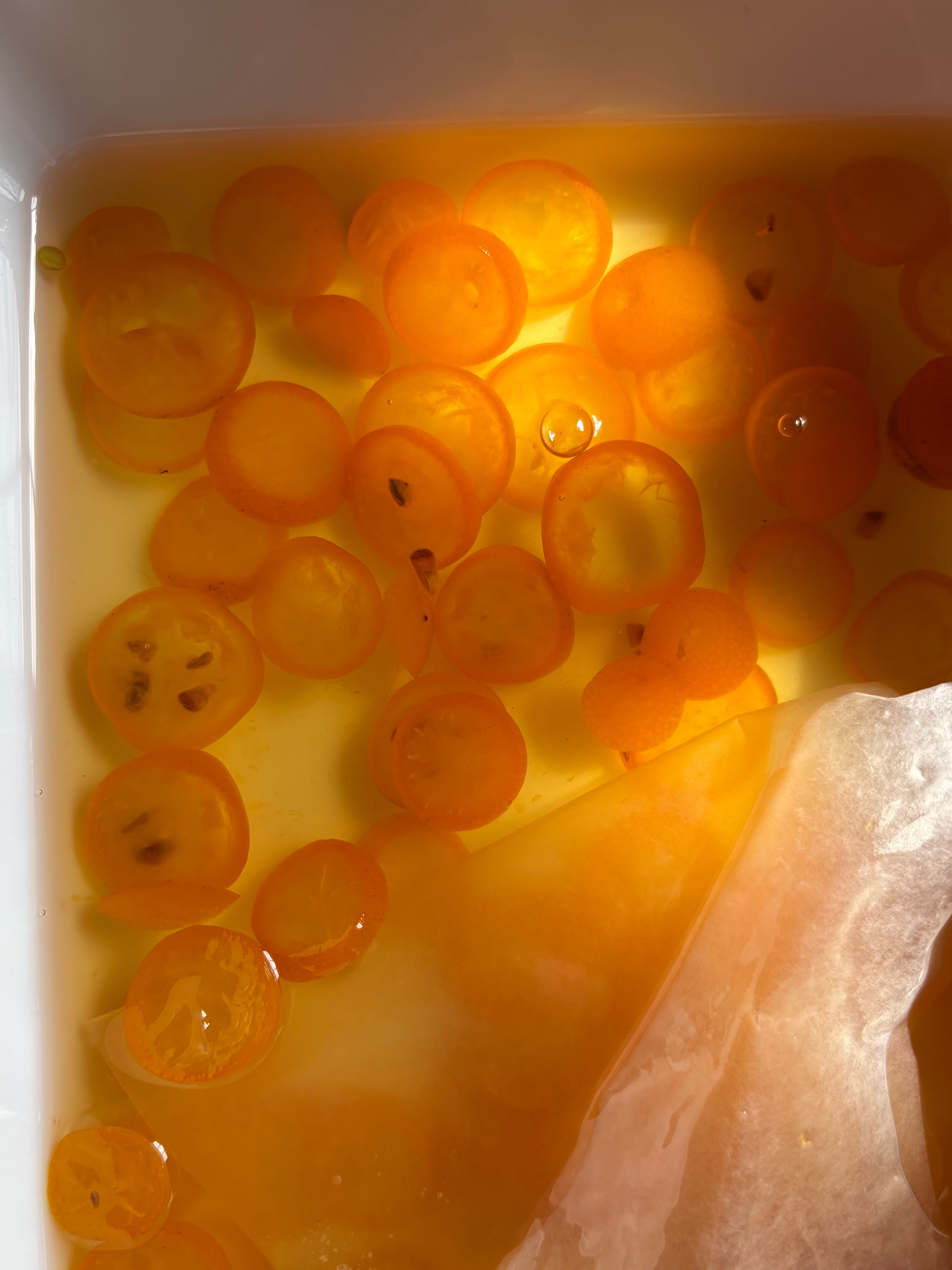 Slice the kumquats into thin coins, a little less than half a centimetre thick. Place them into a small shallow baking dish and cover them with the simple syrup. Cut a piece of parchment to the same size as your baking dish and place it on the surface of the kumquat/syrup mixture to keep the slices submerged. Cover the pan tightly with foil and place in the oven.