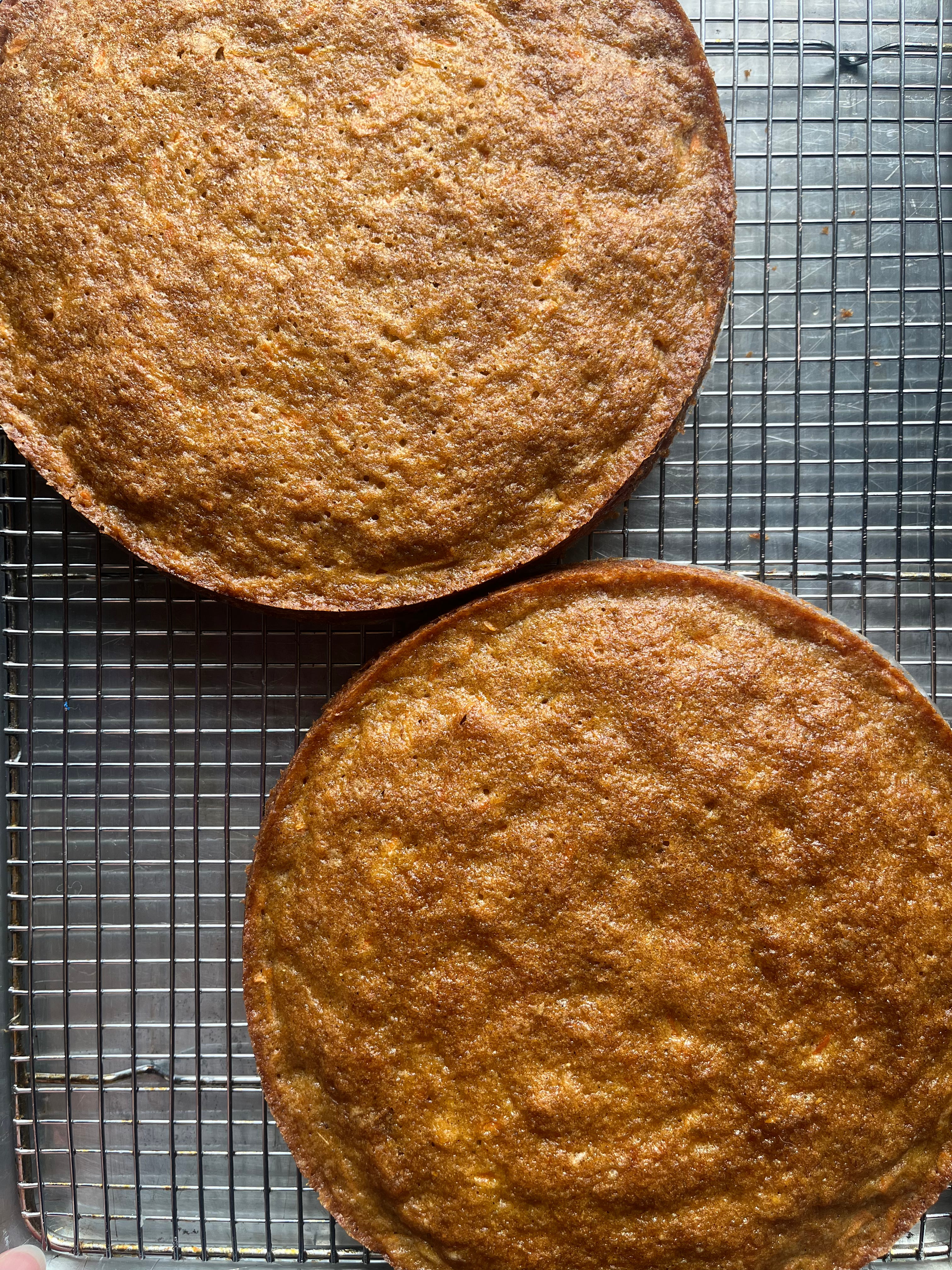 The layers this cake makes are slim - around ¾ of an inch high - but I still like to bake them in two separate pans (rather than attempting to tort a taller cake), as the carrot cake is very moist and sticky, and difficult to trim in half. If you do want to bake this as a single-layer cake, you’ll need a cake pan that is at least 3” high, such as a springform pan.