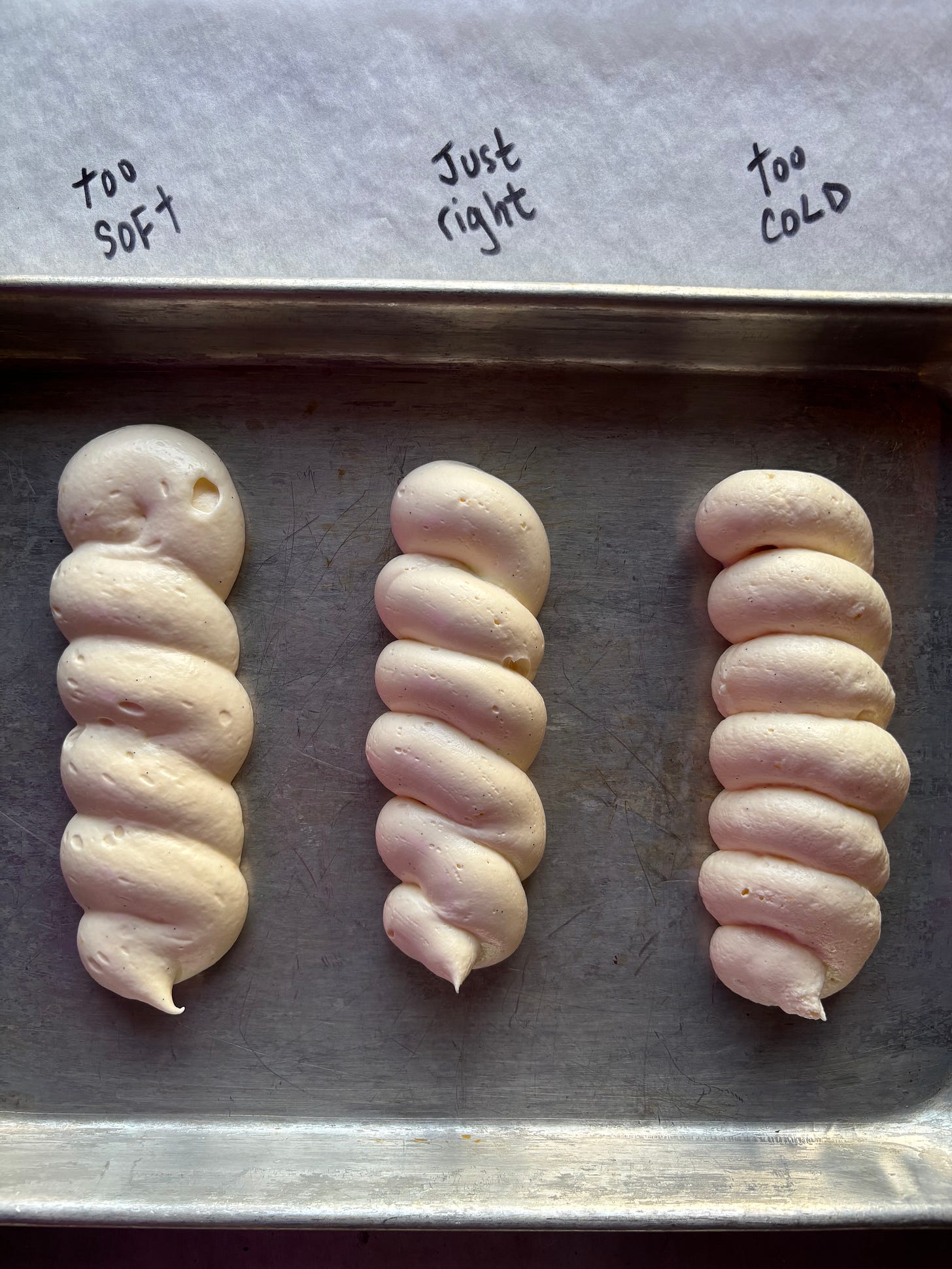 All buttercreams live and die on their temperature when applied. In the photo below, you can see how this buttercream behaves at a range of temperatures. At 78°F (25 °C), the buttercream is too loose, with a greasy appearance. In the centre, the temperature is just right - pipeable and silky at 72°F (22 °C). On the right, the buttercream is colder, and you can see that it’s clumsy to pipe with a slight clotted appearance at 68F (20 °C).