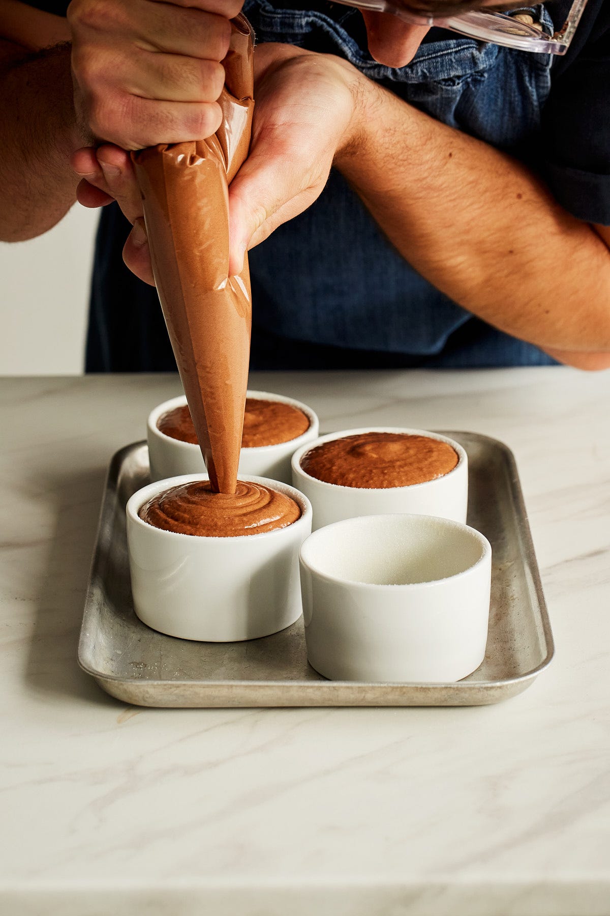 Add the soufflé mixture to a piping bag, and pipe the mixture into the ramekins, filling them to the top.