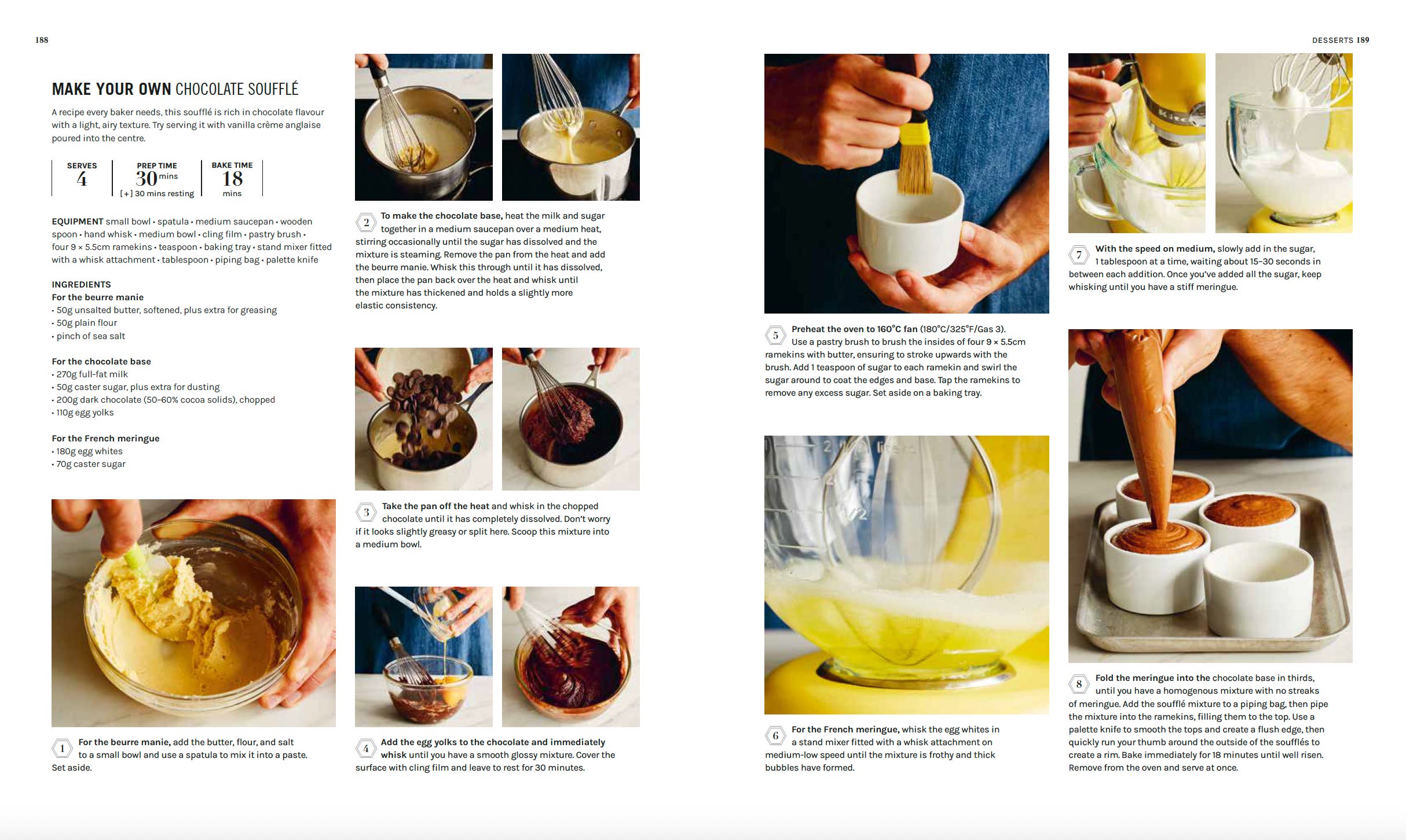 Soufflés are prepared with a flavoured “base” – chocolate, for example – which is traditionally leavened with a French meringue (see p180), to give that iconic structure and texture. While the base can be made in advance, the meringue must always be prepared and incorporated right before baking due to its instability. Once the meringue is whisked to a stiff peak (see opposite), air trapped within the foam gradually begins to dissipate, causing the soufflé to lose structure. The longer a meringue is left to sit, the less volume it retains, resulting in a lower rise and denser texture in the soufflé.