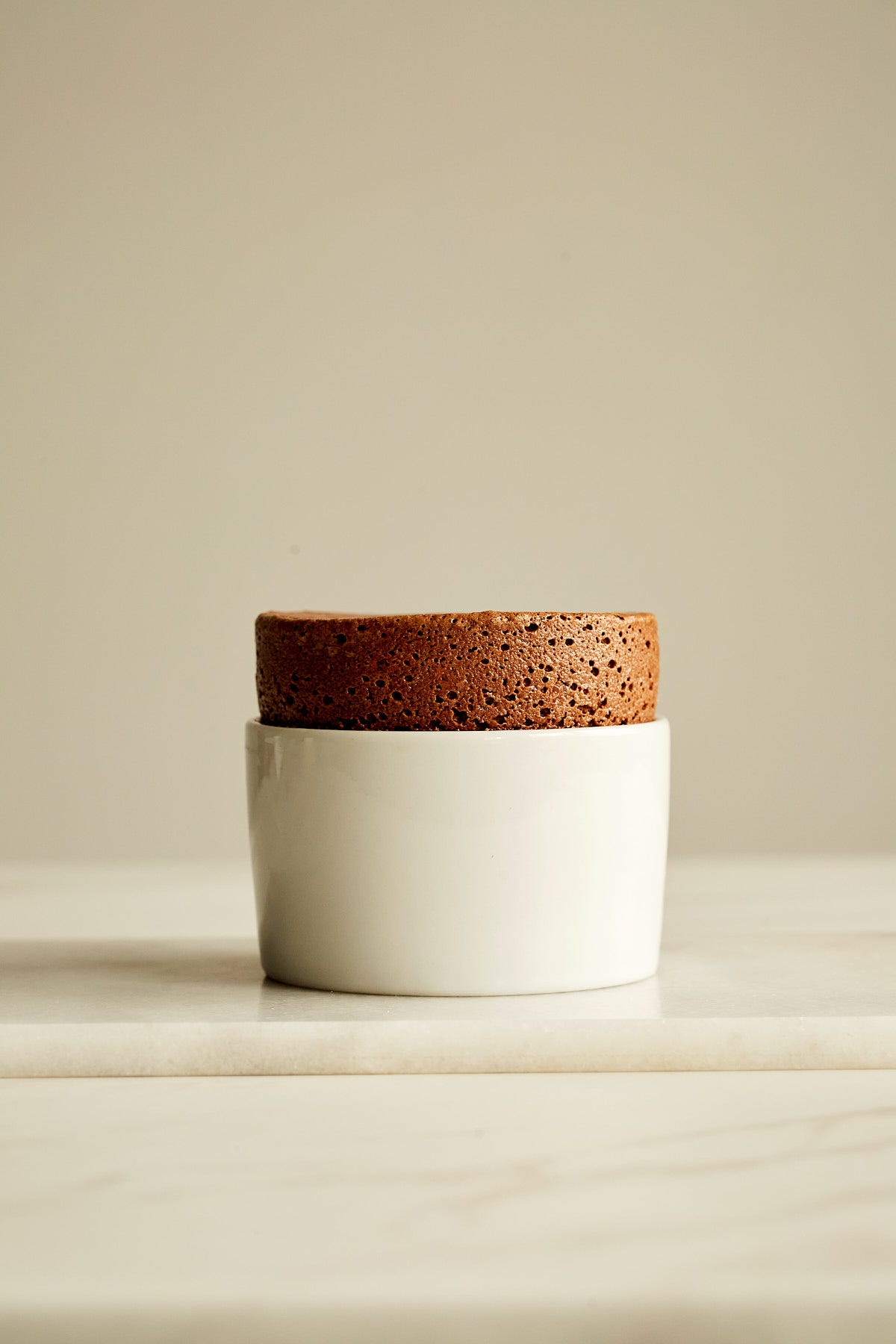 Use a palette knife to smooth the top and create a flush edge, then quickly run your thumb around the outside of the soufflé to create a rim.