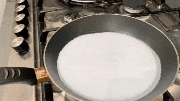 Now, make the caramel - heat the sugar in a frying pan and leave it to melt - you can use a whisk or a spatula to help it along once it’s almost all there