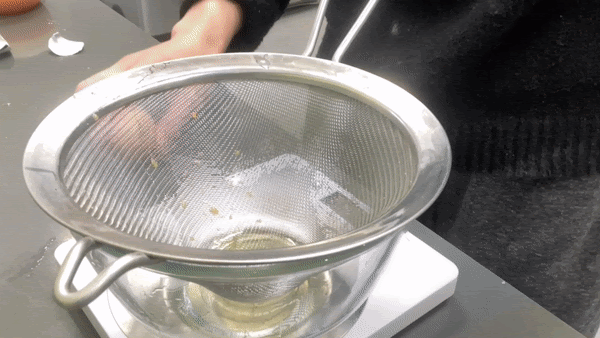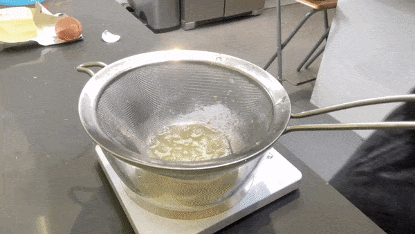 I’ve seen people use a hand blender to break down the whites but after my tests, I think it needs to be gentler than this: The best way to break down your egg whites, I think, is by forcing them through a sieve with the help of a spoon and a fork. Bubbles or froth don’t travel through as much as you’re able to break things down much easier. My recommendation is to break up the whites as gently as possible with a fork and then pass them through a fine sieve several times.