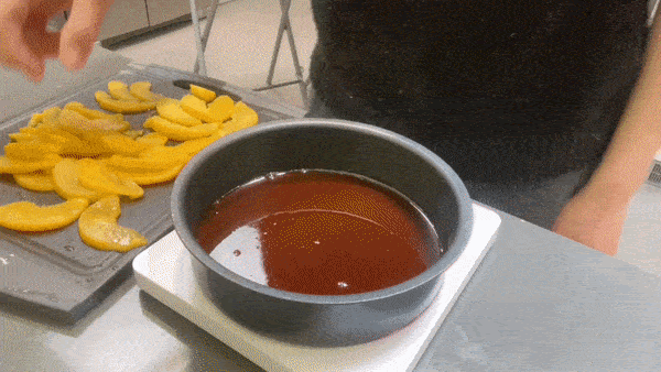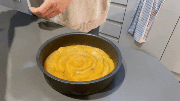 Place the peaches into the caramel, going from the outside in, ensuring there are as few gaps as possible and pressing the slices into the caramel slightly to fuse
