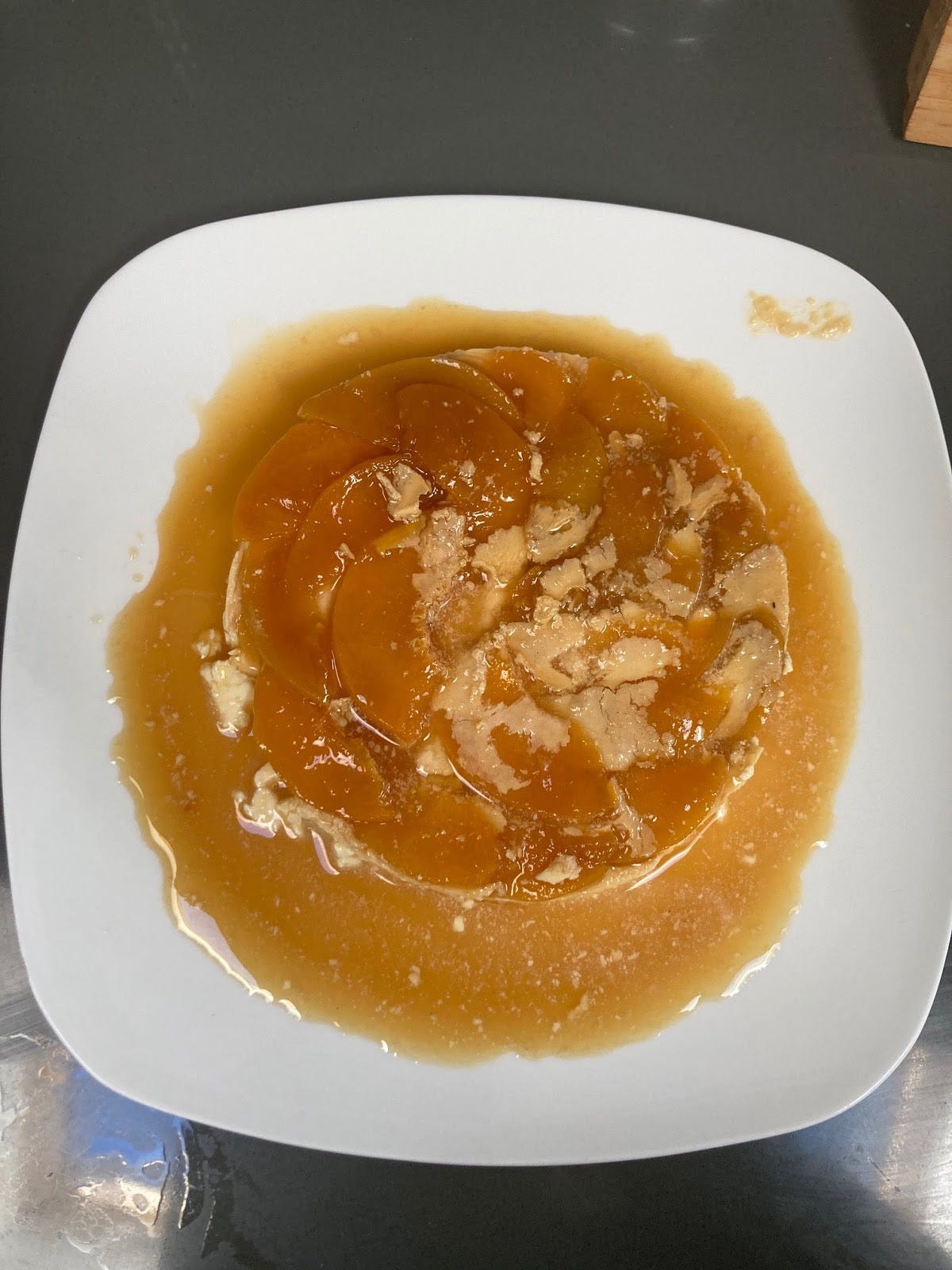 My next fix was to introduce some additional liquid into the caramel (in the form of tin peach puree although it does also work with water) so it wouldn’t set hard immediately and I could instead press the peaches into it, hoping this would create a bit of a seal. This worked very well but still, there were a few floaty bits.