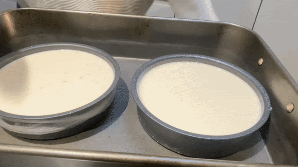 Put the ramekins/tin into a larger baking dish. Pour boiling water so it reaches ½ way up the side of the dish
