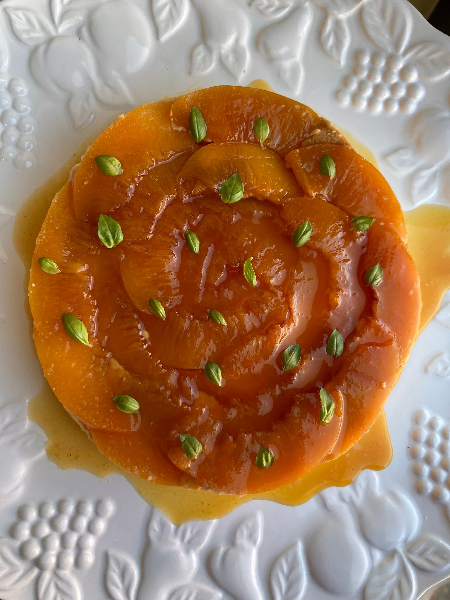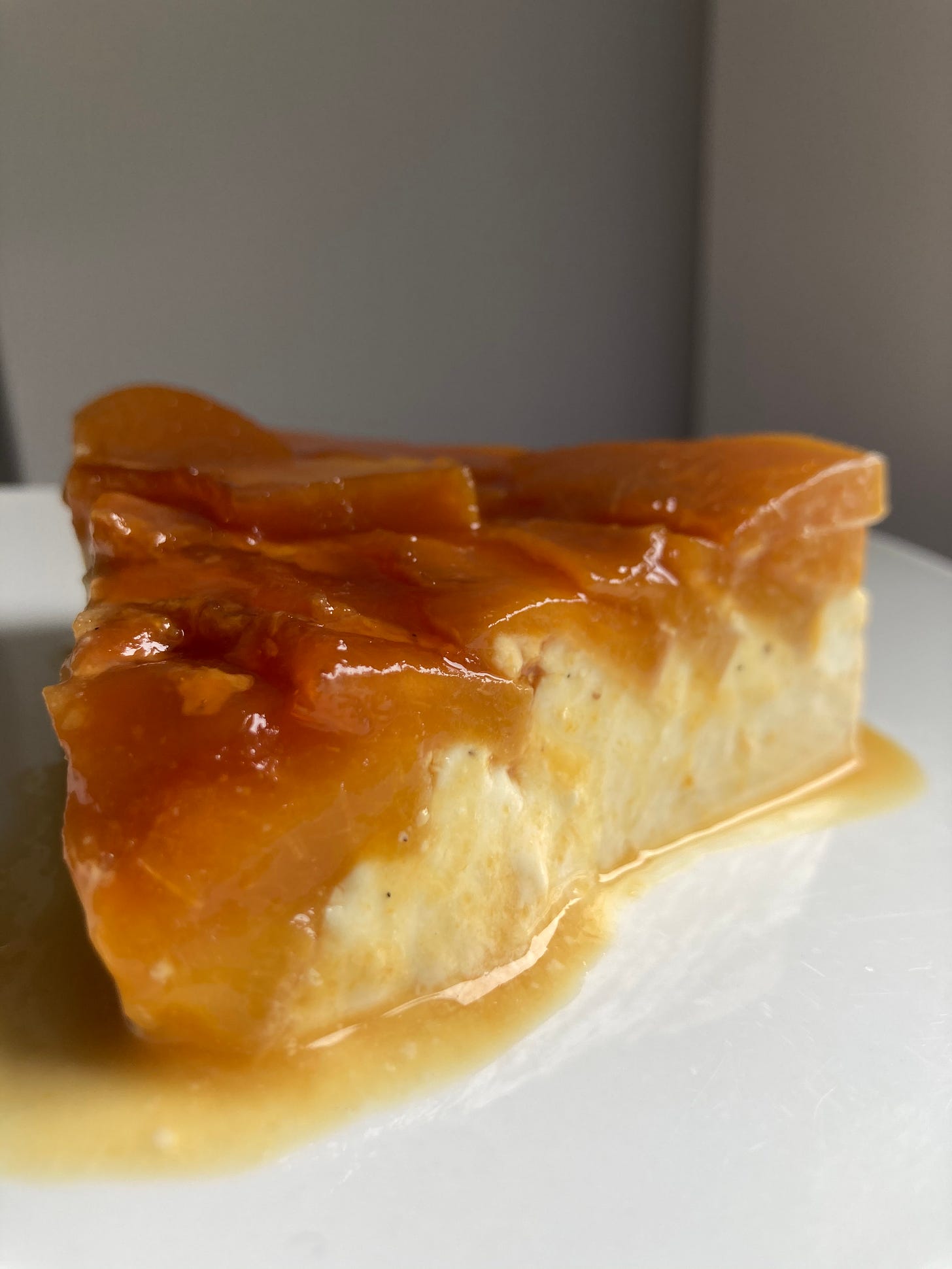 Finally to fix this, I turned to my favourite friend - the freezer. Before filling with custard, I let the peaches set firm and the caramel to harden up a bit so it wouldn’t get dislodged. The results? Perfect - nothing was displaced and when I turned it out the next day, I finally got what I was looking for - a beautiful peachy caramel, neatly organised and glowing. A genuine thrill!