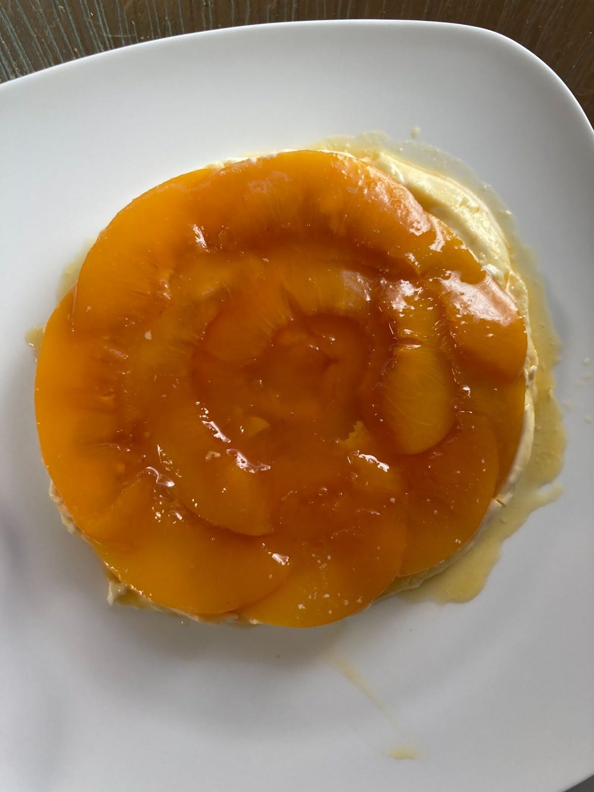 When it baked, custard seeped through the peaches and ruined the beautiful peachy pattern on top