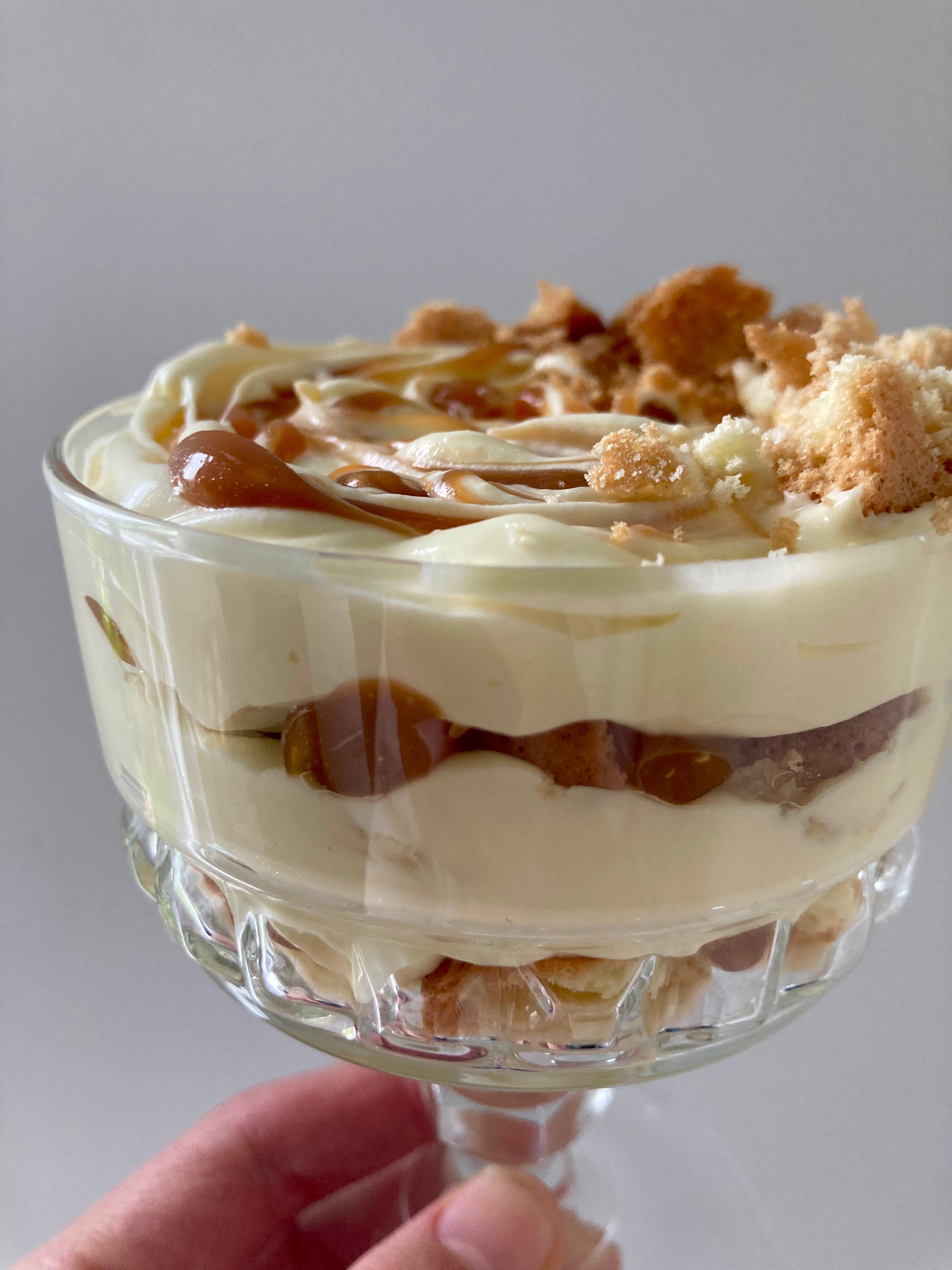 Start layering up - banana, followed by crushed up biscuits and a drizzle of caramel and finally adding the custard cream. Continue layering, finishing with a swipe of cream on top. You can either make a swirly caramel pattern OR just decorate with biscuit crumbs and sauce, Up to you!