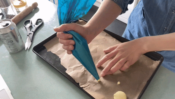 Scrape mixture into a piping bag and pipe rounds onto a baking sheet. You could also use a teaspoon and spoon it on. They’ll be messier but you’ll be crumbling these up to use them in the end