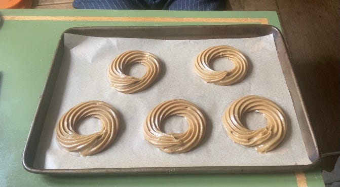 As I continued thinking about the tiramichoux, I decided that this would be the perfect flavour combo to present in the lovely Paris-Brest shape. If youre not familiar, it’s a sort of wreath / doughnut looking thing. It was originally created in the early 20th century to commemorate the annual cycling race between Paris and… Brest, obviously. Usually flavoured with praline cream, it is a delightful thing to both look at and eat.
