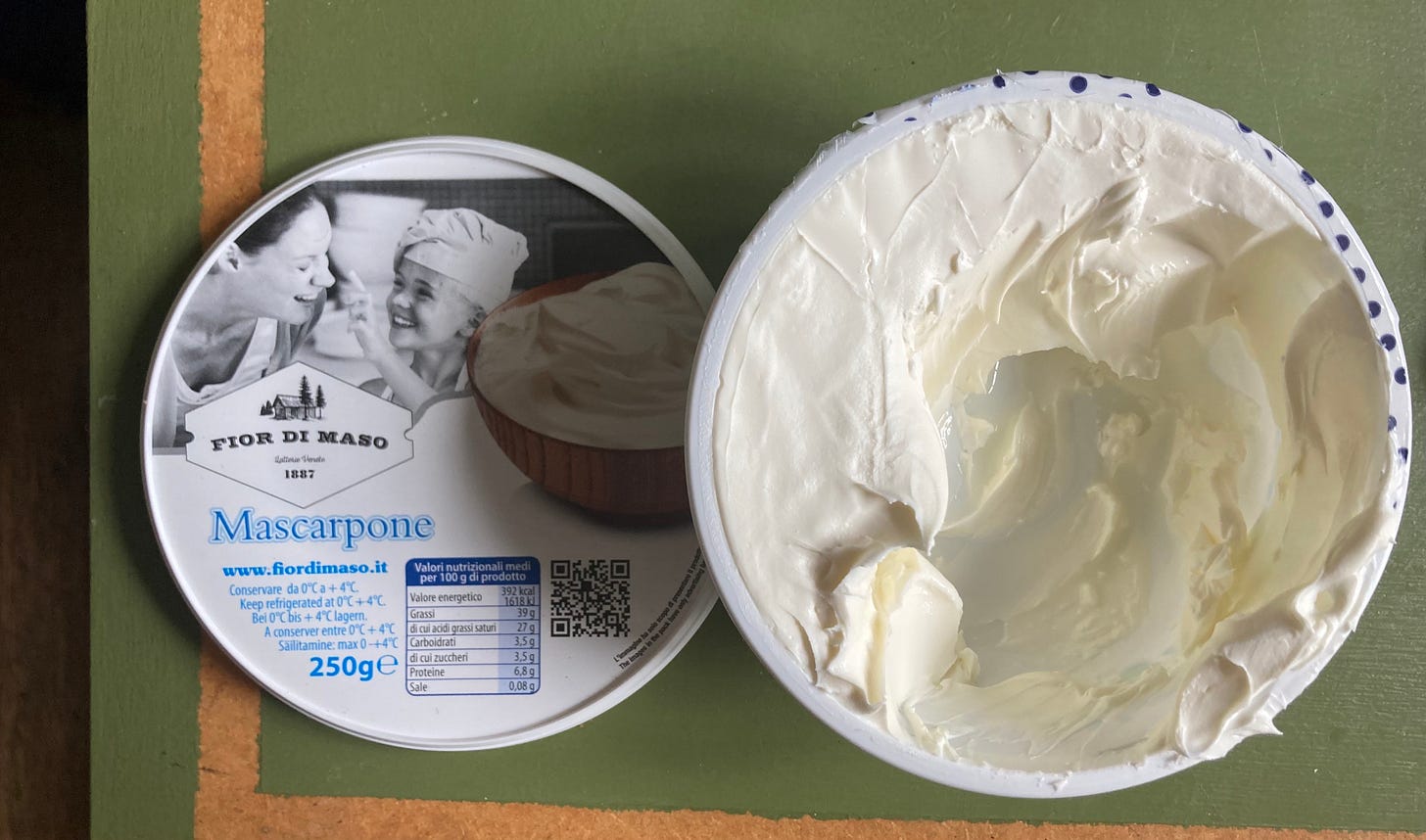 350g mascarpone - if you can, get nice proper Italian stuff. I tried this recipe using the one from sainsburys and it went really lumpy and was hard to work with. Here’s a pic of the one I used - it should almost have a clotted cream consistency rather than being one big chunk: