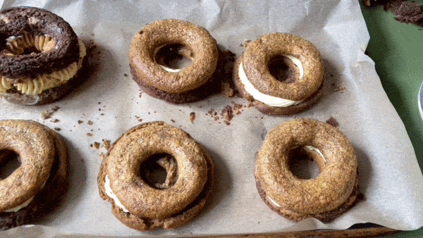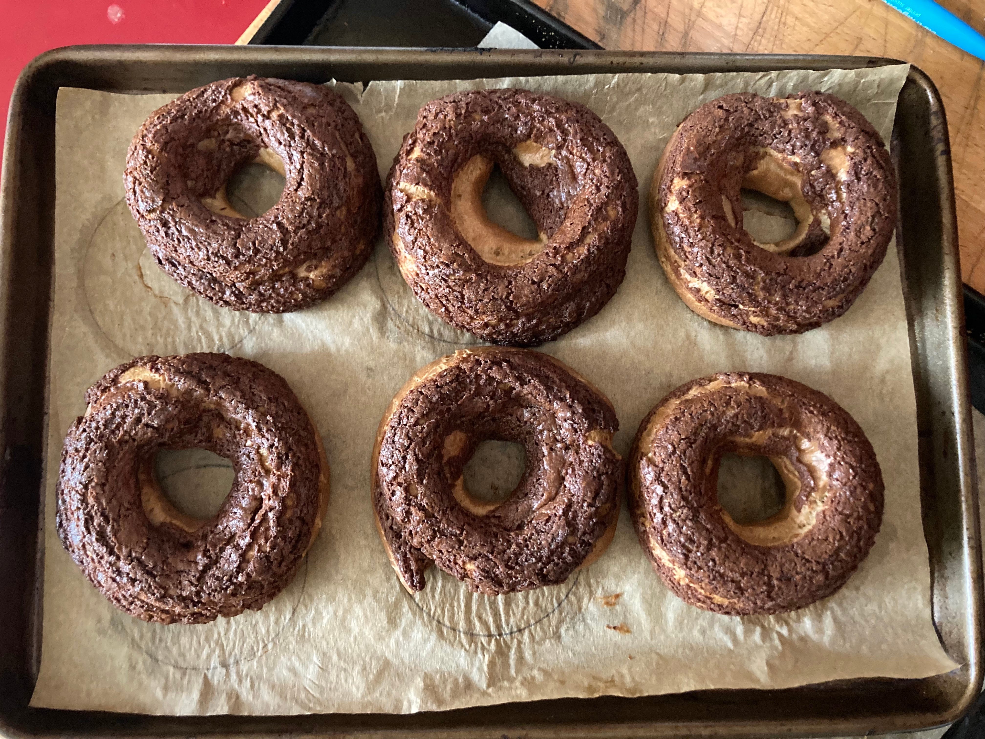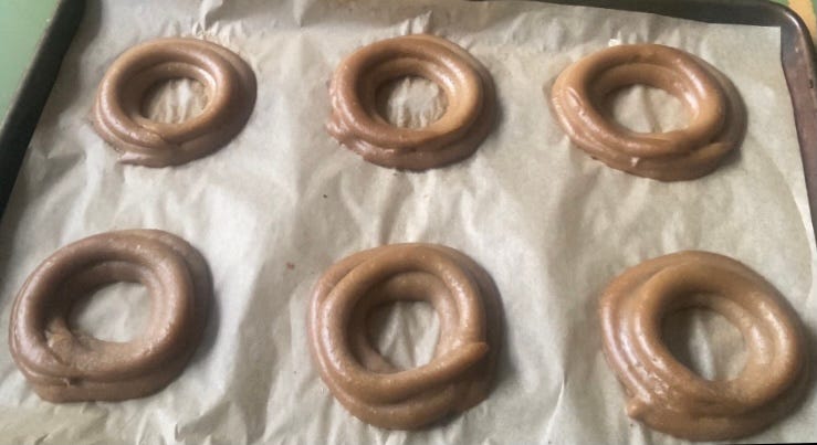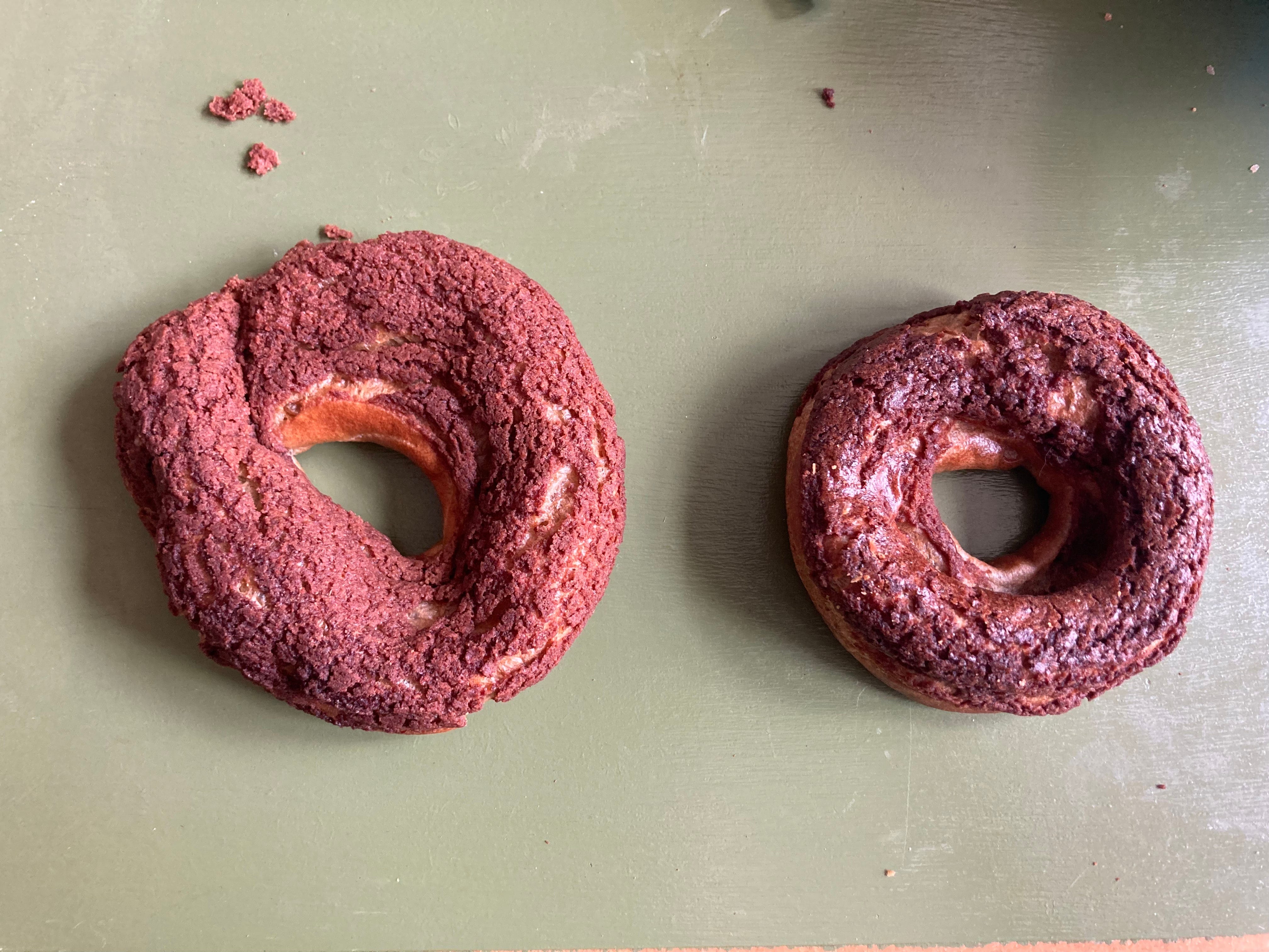 I tried by piping two fat lines on top of eachother which was a bit better… but still pretty much the same. Sure that this would work, I tried the same thing twice more using slightly different piping tips before realising it was not the way to go for the dreamy tall doughnut I was envisioning.