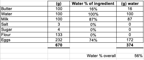 Since choux is steam powered, it has a very high water content. Let’s look a bit deeper into that: