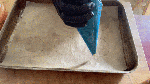 Draw 8cm circles on greaseproof paper to use as a guide. Turn the paper over so you’re not piping choux onto sharpie