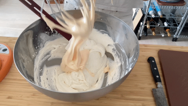 When you whip the cream for your parfait, you don’t want to take it too far. When you fold together the pate a bombe and cream, you will continue introducing air into the mixture so you don’t want to accidentally overwhip. So, err on the side of caution for this - you want it to have enough body to hold itself up but don’t take it so far it wants to split on you!