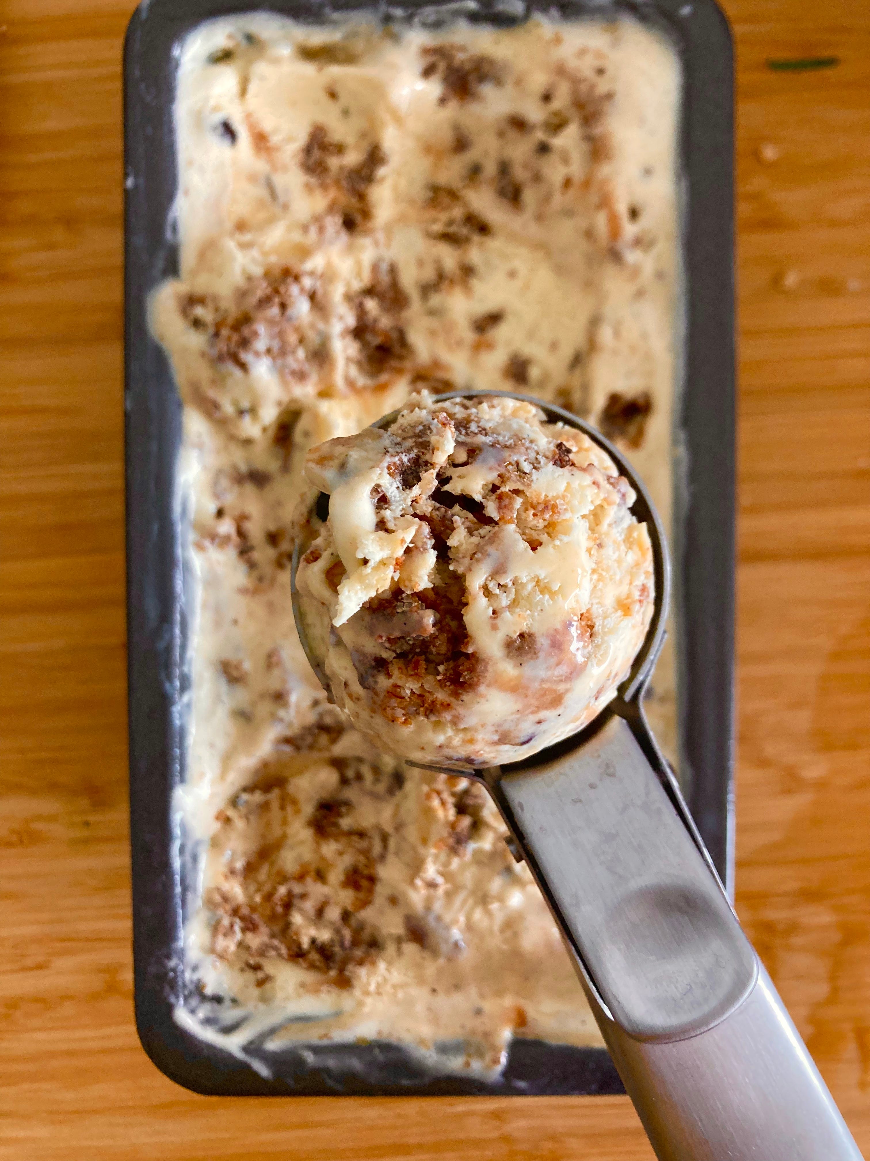 This base recipe will be the foundation to all of your parfait / ice cream dreams! Ripe for mixing things in or adding nut pastes, let this vanilla parfait base be the springboard you need to make all the custom desserts you’ve ever wanted. I made up a batch of this and stirred through caramel sauce and chocolate covered cookie/hazelnut bits (I used my base recipe from this article). It was mad tasty: