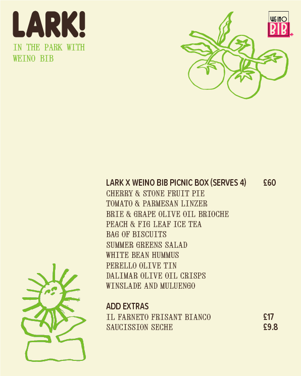 I’m so excited to announce the menu for next weekend’s lark! x Weino Bib picnic box collaboration this Saturday 31 July. One of the reasons I started the pop-up was so I could collaborate with my favourite brands and people and Weino Bib are definitely that. Together, we’ve put together a hamper of dreams to serve four people and I’m so excited to unveil the menu to you now: