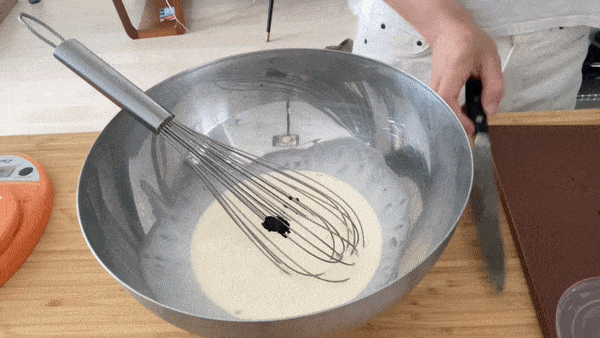 Change the mixer speed to low. In a steady thin stream, pour the sugar syrup down the edge of the bowl, avoiding the whisk so it doesn’t splash. Also, be careful the vanilla pods don’t fall in. You need to do this step quite slowly as not to accidentally pool the syrup at the bottom of the bowl