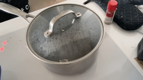 Heat the sugar syrup until it reaches 118c. To avoid crystallisation, for the first 1-2 mins as its heating up I like to add a lid. This means any random sugar crystals will be dissolved during condensation