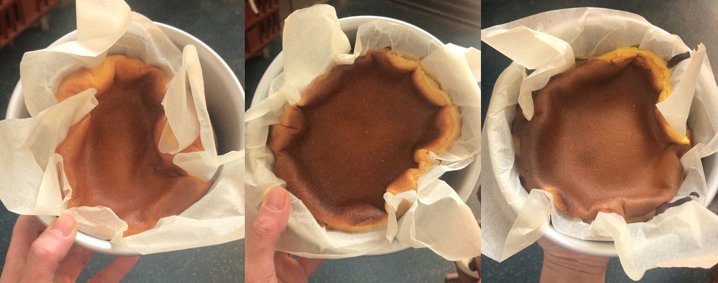 As for the pan size, the larger the surface area, the better contrast of textures you’ll get - similar to the basque cheesecake. The smaller you go (aka, the more home baking friendly!) often the harder it is to achieve those dramatic textures.