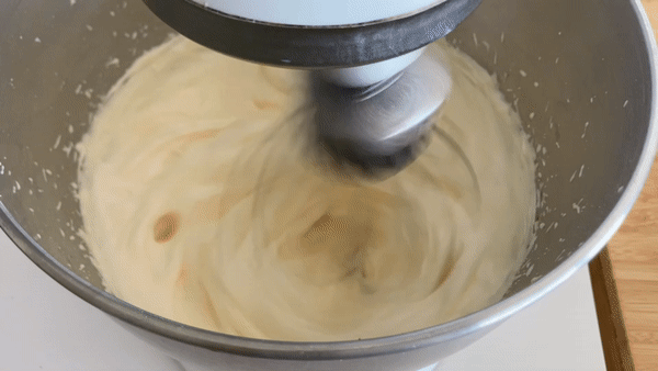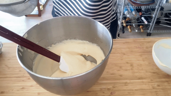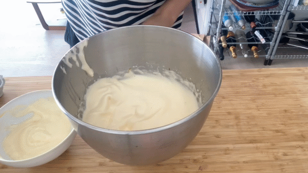 For the Pão de Ló, this super fine stable foam isn’t as important as the final product is going to be jammy/undercooked. So, for the mixing for this cake, I still use the three stage mixing process but I reduce the times significantly.