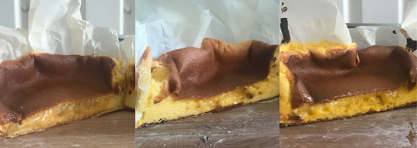 On the extreme side, like the ‘best cake in the universe’, the goo or ‘egg cream’ is totally liquid and expansive, ending up in a puddle at room temperature. For both the rectangle and round shape, I tested a variety of baking temperatures and times. For the round mould, the surface area lends itself to a short but very hot bake so a crust can form. To get a similar result on the rectangle, it needs to be at a lower temperature due to the increased surface area, though the baking time stays similar.