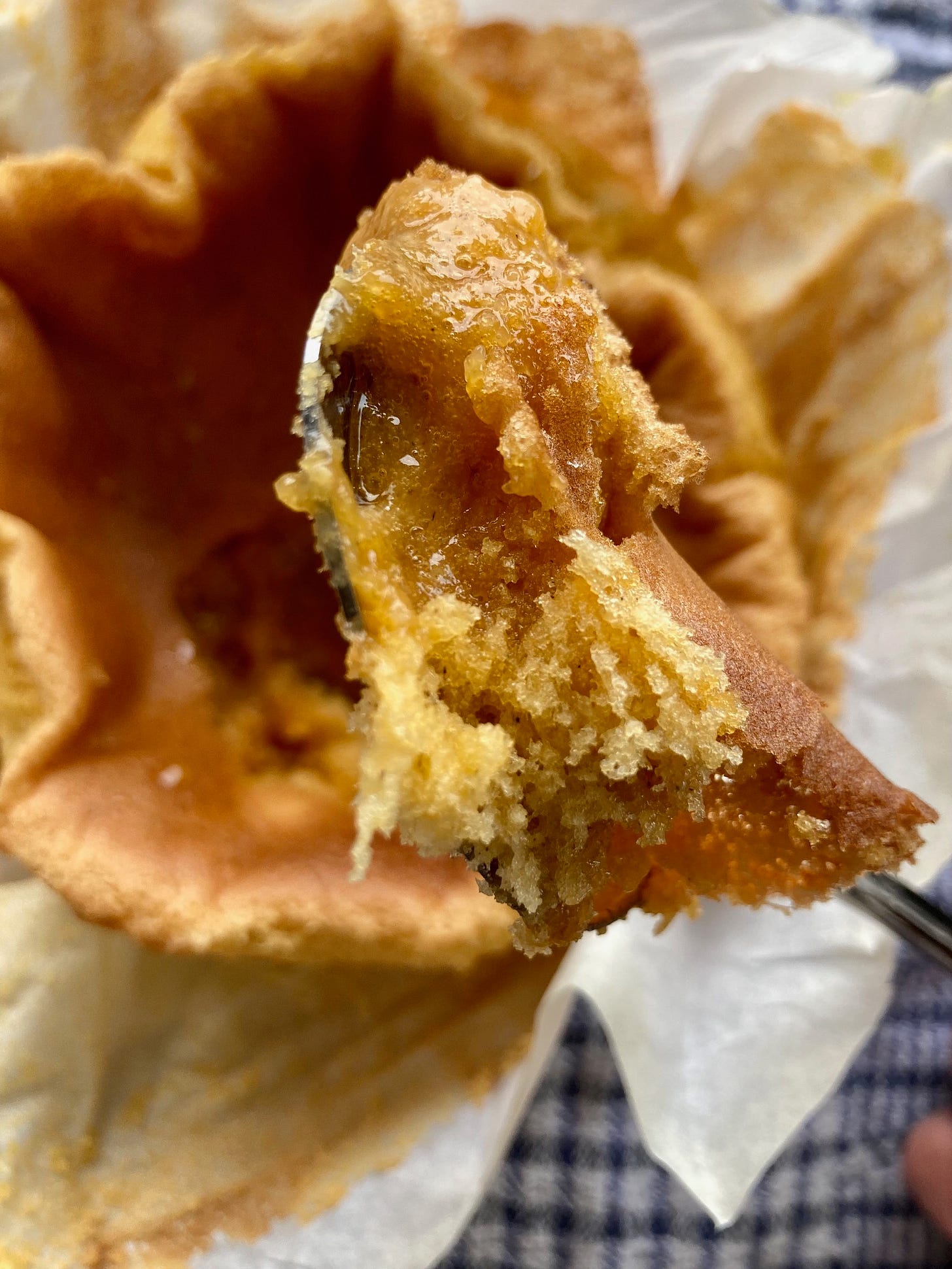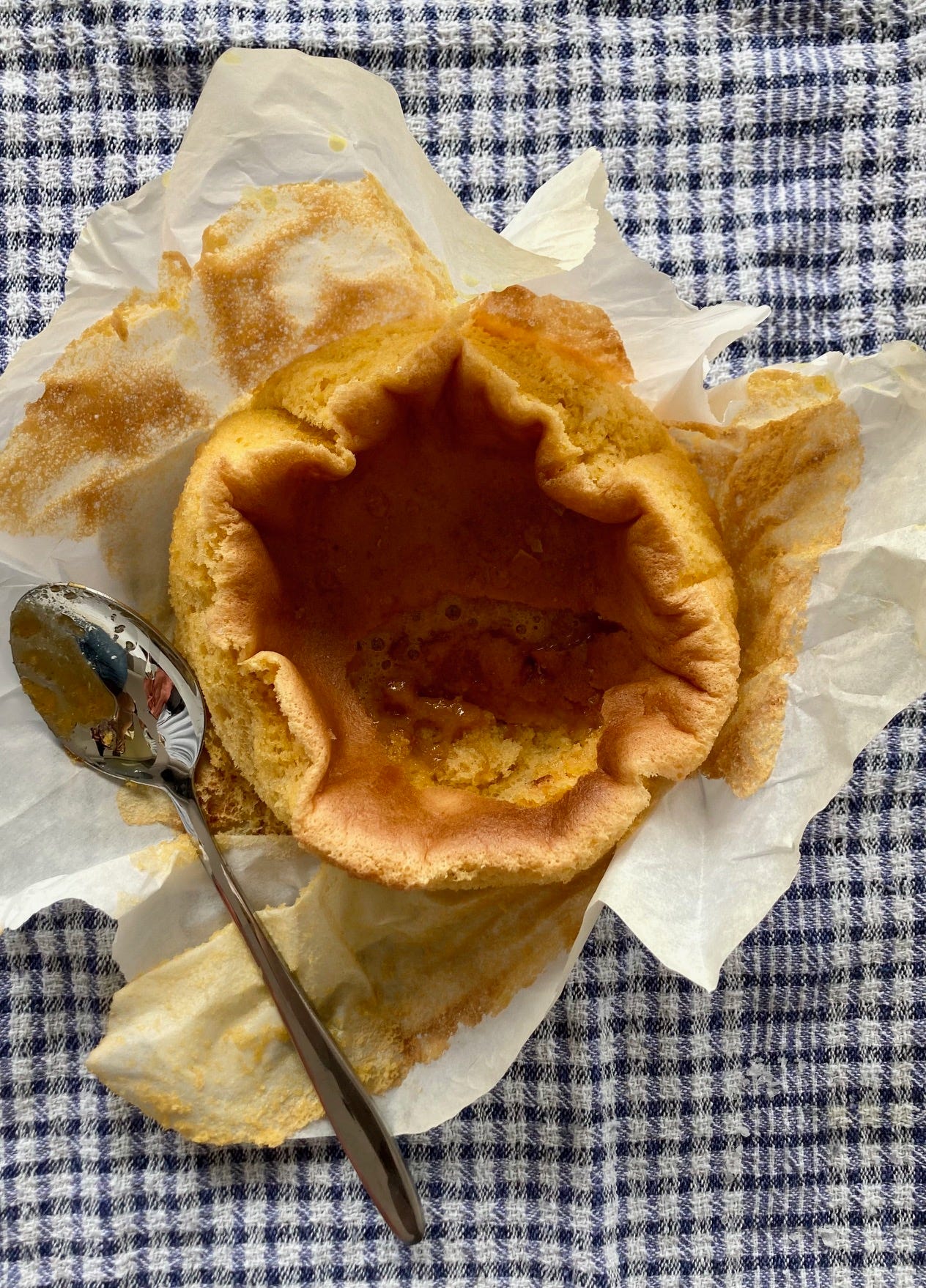 Described on the internet as a ‘fallen souffle cake’ or a ‘gooey egg cake’ among other things, the Pão de Ló is an ultra soft, chewy and light sponge cake that is baked HOT and short to achieve two textures. It is perhaps an unconventional cake but my GOD, it is good. It has basque cheesecake energy in that you bake it high, it souffles up then falls as it cools, plus you line the tins in the same way (“rustic”).