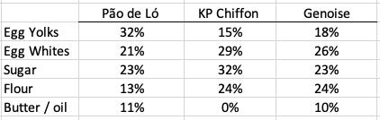 Compared to chiffon and genoise, Pão de Ló has a higher proportion of yolks and whole eggs overall. Its sugar content is within the same range but it has a much lower % flour. The oil % is on the same level as the butter in the genoise, but acts differently - yes, it enriches, but the liquid fat adds a characteristic that butter can’t achieve. You go olive oil!