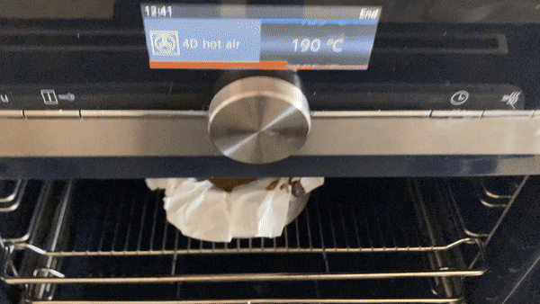 Pre-heat oven to 210c fan (for 6 inch round tin) or 180c for the rectangular tin