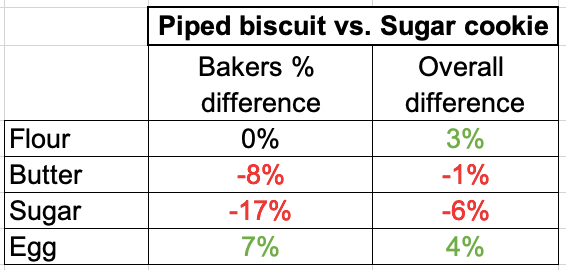 The major differences are in sugar and egg, but let’s go through them. The higher proportion of egg - which adds moisture and flavour and leads to the melt in the mouth texture. The proteins present in the egg also coagulate which helps give our biscuits a defined shape. The proportion of the fat is a bit lower, but not significantly. The sugar is much lower in the piped cookie - this will result in a less sweet, more butter forward flavour, but it also results in a less crisp, but more buttery texture.