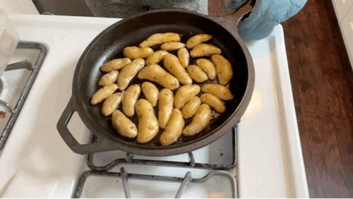 Melt butter in a pan - the same pan you’ll be baking in, if possible - and once foaming add in halved potatoes, wiggly piggly style looks good!