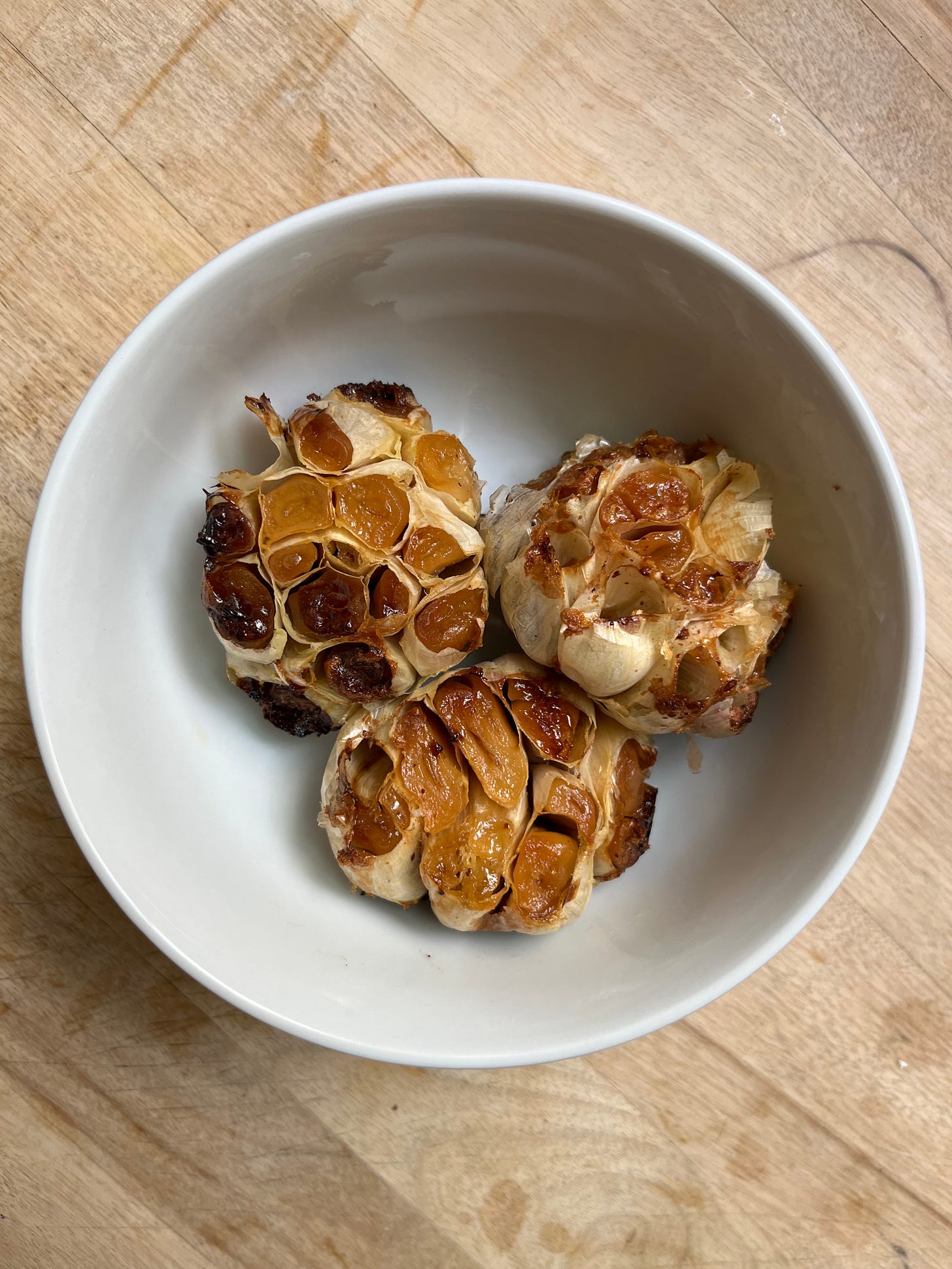 As garlic is heated, the intense allicin compounds - which are responsible for the pungent garlic aromas - break down, which converts the flavour and texture. The cloves can literally be squeezed out into dishes, or straight onto hot toasted baguette.