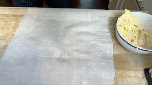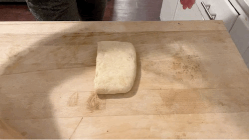 As we have made our butter block in advance, roll back and forth on it several times so it is pliable and bendy (GIF in ‘roasted garlic) section