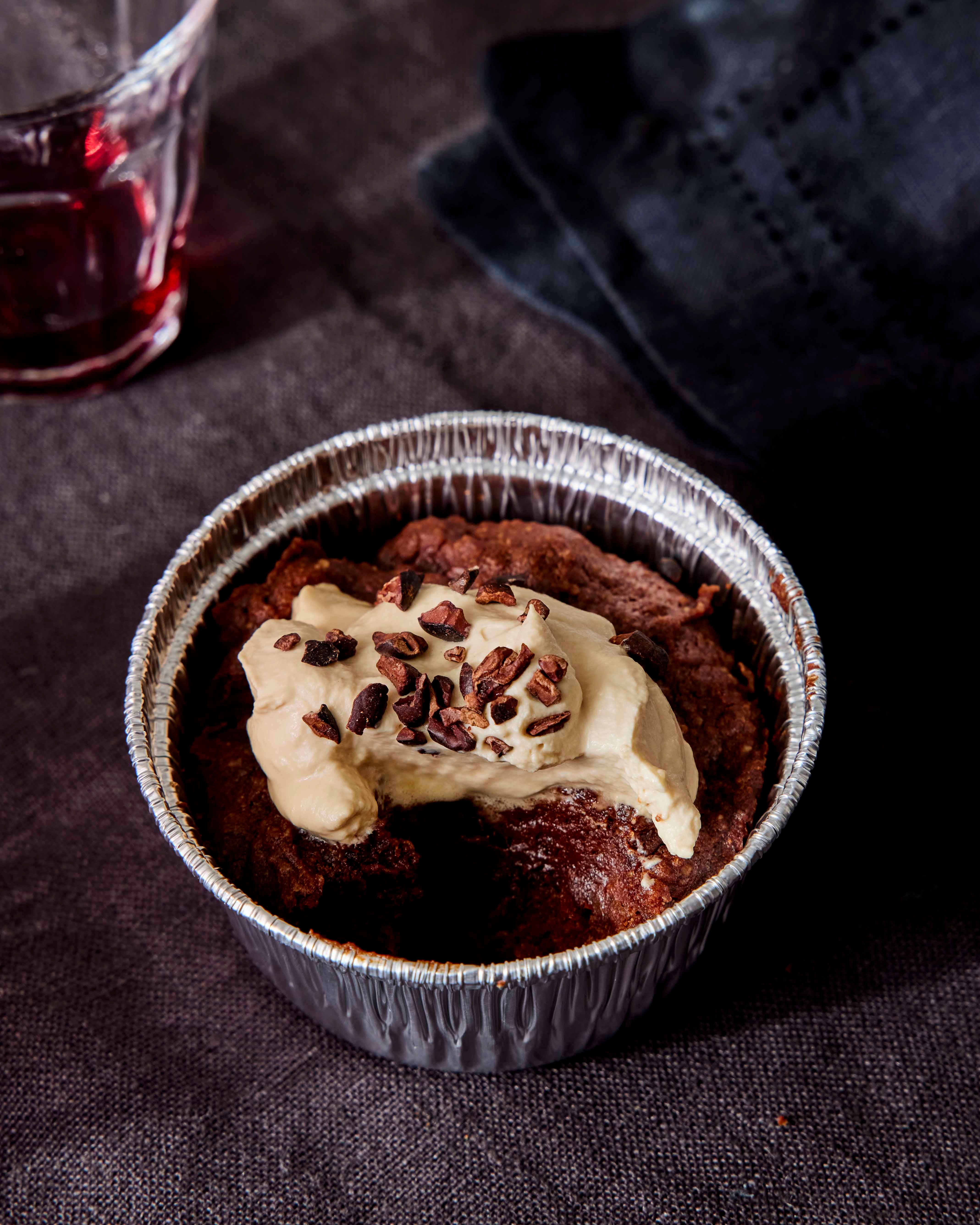 Bake on the sheet pan until the tops are lightly cracked but the interior is still fairly moist and gooey, 15 to 18 minutes. If you’ve made the cakes in ramekins, they are ready to serve. If you’ve used a muffin tin, let the cakes cool in the pan on a cooling rack for a few minutes before unmolding them, then serve them warm or at room temperature with, optionally , a dollop of espresso crème fraîche and a sprinkle of cacao nibs. These cakes are best served immediately, but they are also good when tightly wrapped and chilled in the refrigerator for up to 5 days.