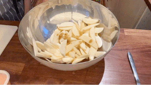 Peel and slice apples to around 4mm-5mm thick. Place into a bowl and add the deglazed pan juices. Toss together then sift the 5g of flour on - don’t put it in one big clump or it might coat unevenly. Toss the apples again.