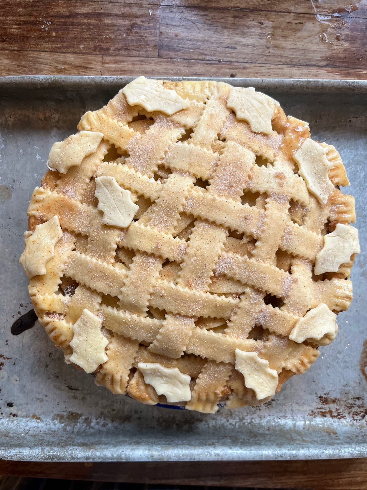 Chloe also has some festive biscuit cutters (some vintage, some from Michael’s, a craft store in the US) and uses pastry offcuts to make little pastry leaves and apples to decorate the edge of the pie. Finally, it is dusted with cinnamon sugar - try a tsp per 50g sugar and adjust from there.