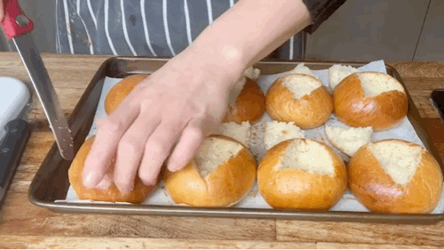 When you are ready to assemble, cut a triangle shape from the top of each bun and remove the innards of the bun to add into the mandelmassa.