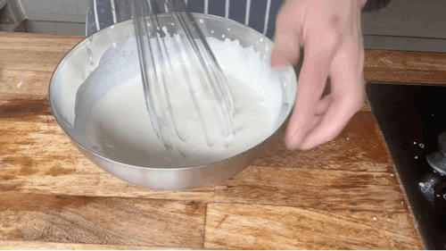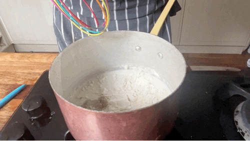 Heat on a medium temperature, whisking/stirring all the time until it thickens. It will be very thick. Take off the heat and move into the bowl of a stand mixer, leaving to cool slightly (so you can touch it!)