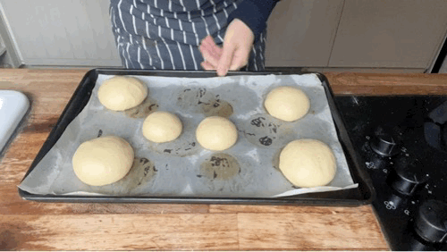 Divide dough into 55g portions. Shape into balls using a cupped hand. Place on a tray with a few inches of space in between. Cover lightly with clingfilm and leave to proof until very puffy 1-2 hours