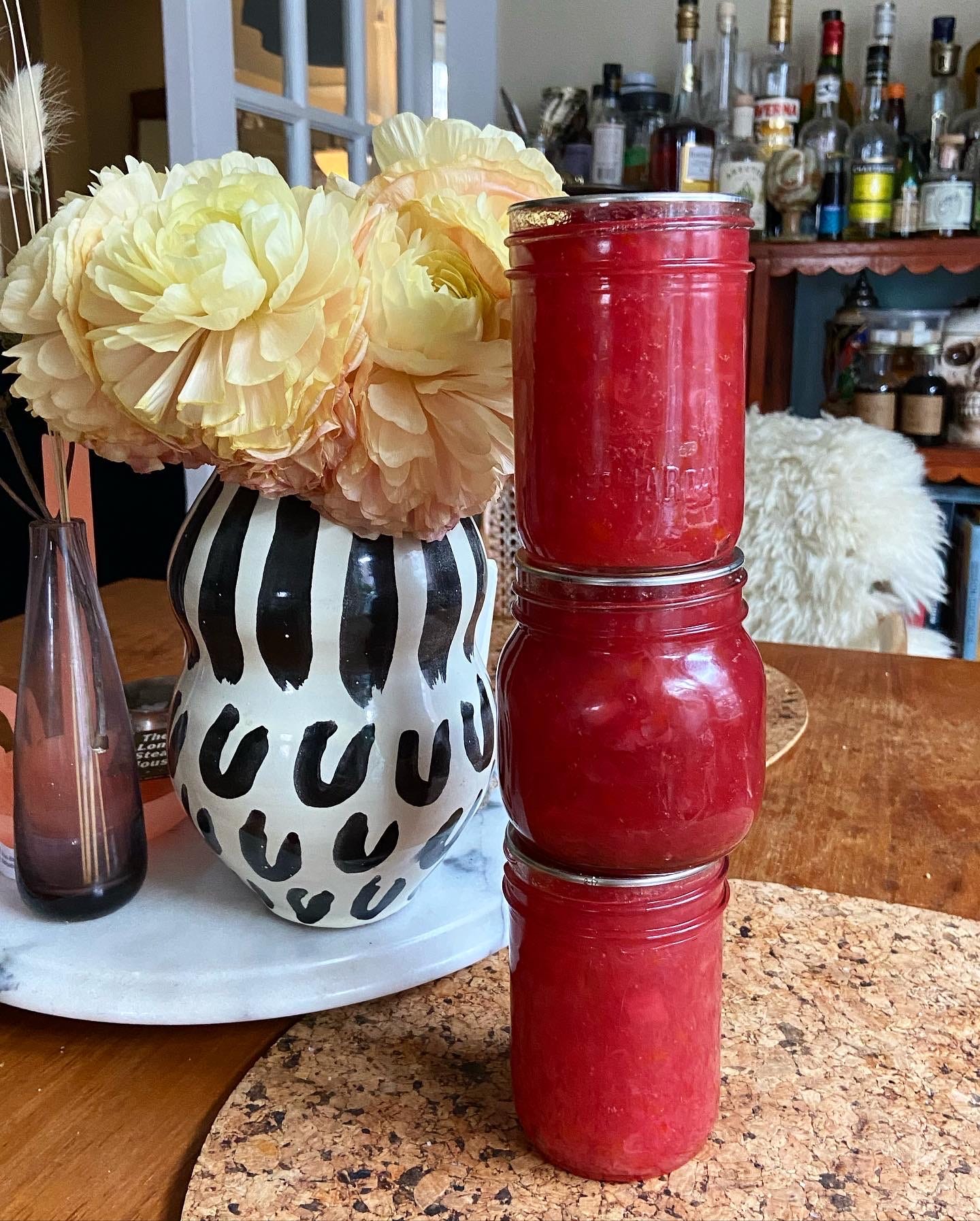 Place jars in water bath, cover and bring to a boil over high heat. Reduce heat to medium and start timer for 15 minutes. When the timer goes off, turn off heat, remove lid, and let jars sit in water for 5 minutes. Remove jars from water to a wire rack, keeping them as upright as possible (a jar lifter is a great tool for this!). Let cool, undisturbed for 24 hours before checking seals. Label and store somewhere cool, dark and dry, where they will keep at least 9 months.