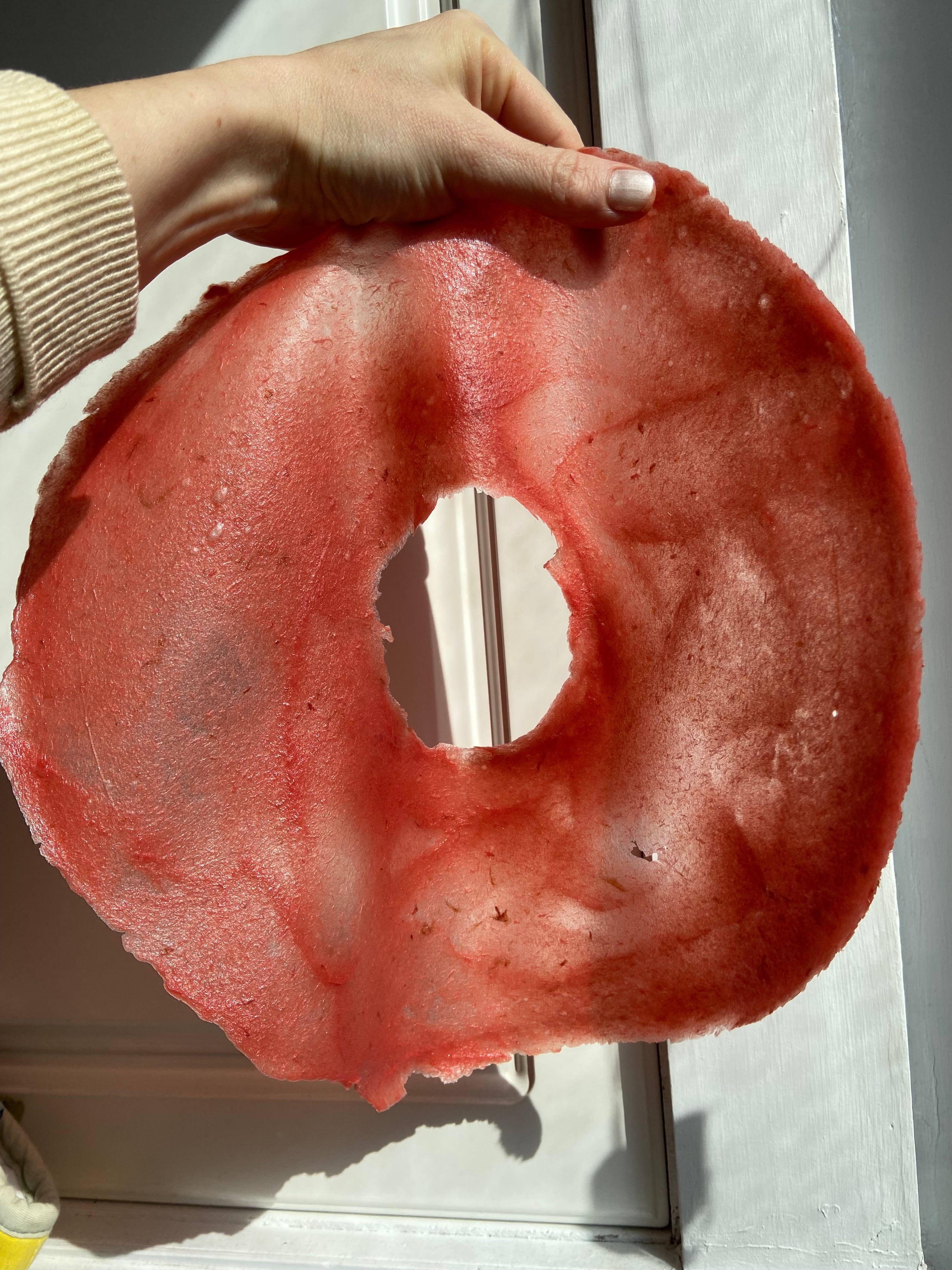 STOP! While that pulp leftover from making syrup might seem spent and destined for the compost, there’s still so much good in it. You could treat it as a kind of stewed rhubarb and eat it on yogurt for breakfast, but I like to make cute pink fruit leather to delight children and adults alike.