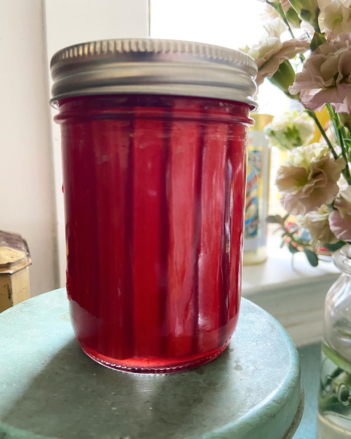If you love delicate sticks of baked or poached forced rhubarb—for topping rice pudding, yogurt, pound cake, or just eating with custard—this method is for you. Raw packing lengths of thin stalks results in shelf-stable jars of perfectly cooked rhubarb that keeps its shape admirably. It’s cooked just enough to be tender, packed shoulder to shoulder with its friends. The key is to pack the jar so tightly (without damaging the stalks) that you can turn it upside-down (lid off) with none falling out.