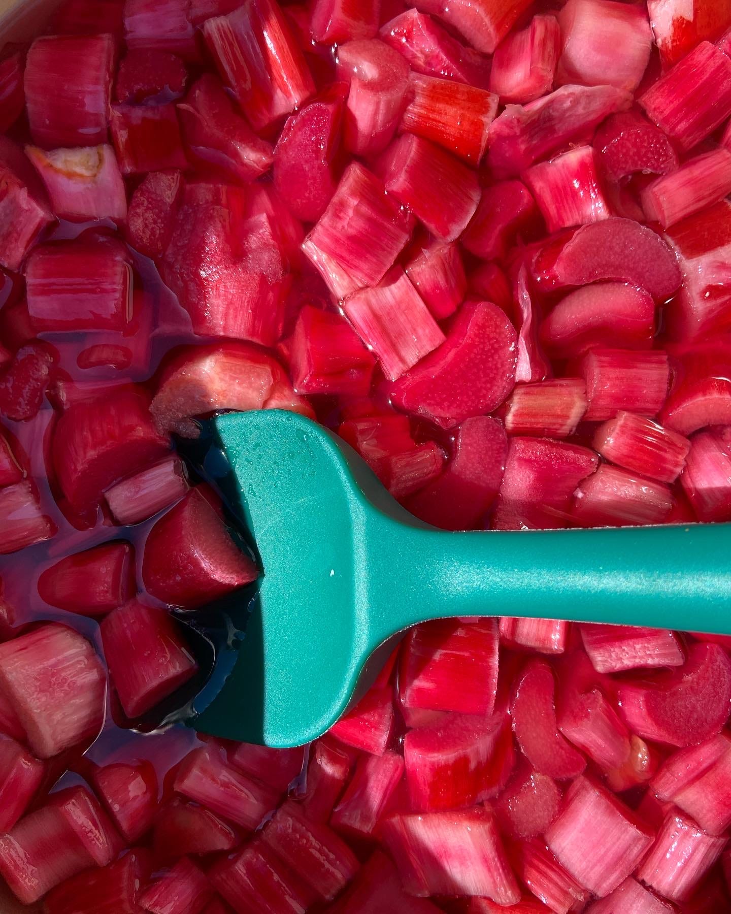 Transfer the rhubarb mixture to a pot or preserving pan. Heat on medium-high and bring to a hard boil, stirring frequently.
