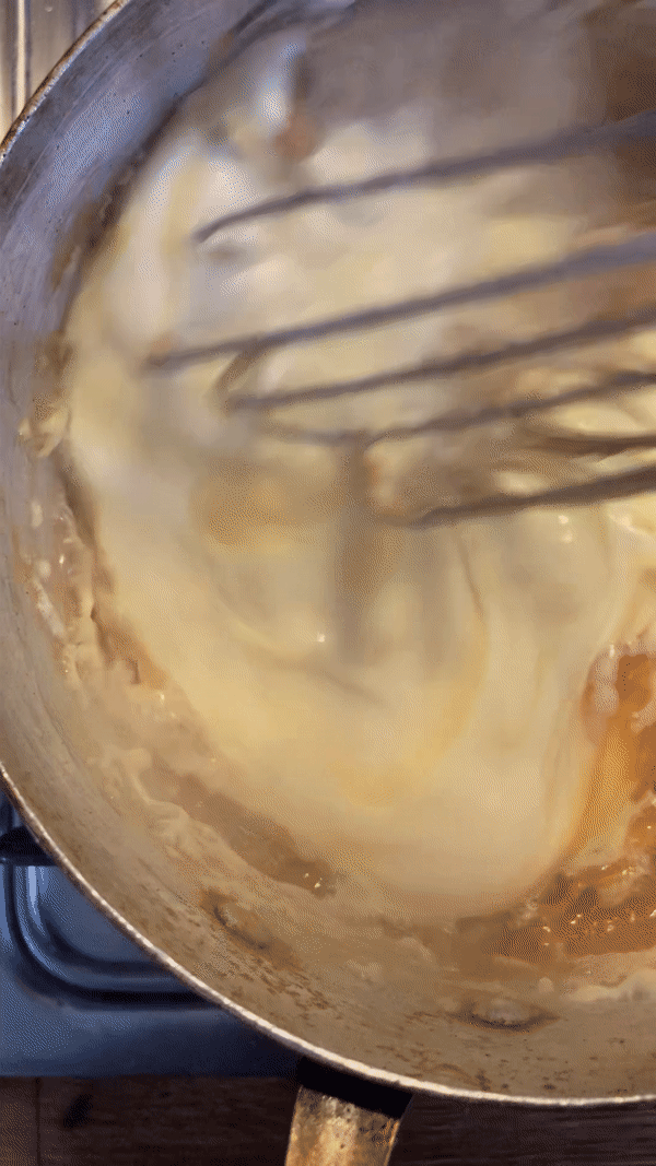 Once you’ve reached the desired colour, add your cream slowly. Be aware it will sputter and spit and steam and you need to whisk it well