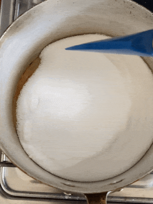 Meanwhile, get your caramel on. In a pan, add all of your sugar and put onto a medium heat heat, stirring occasionally until it has melted, there are no lumps of sugar and it is a light amber. We’re not going for anything too crazy dark here