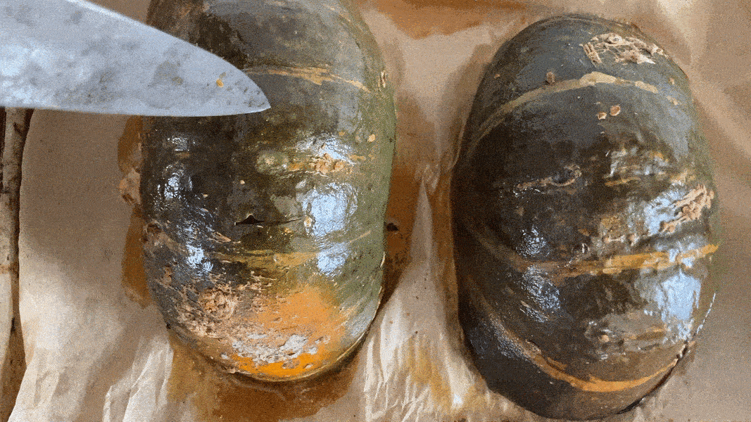 Cut your pumpkin in half , remove the seeds then and place cut face down on a baking tray with parchment